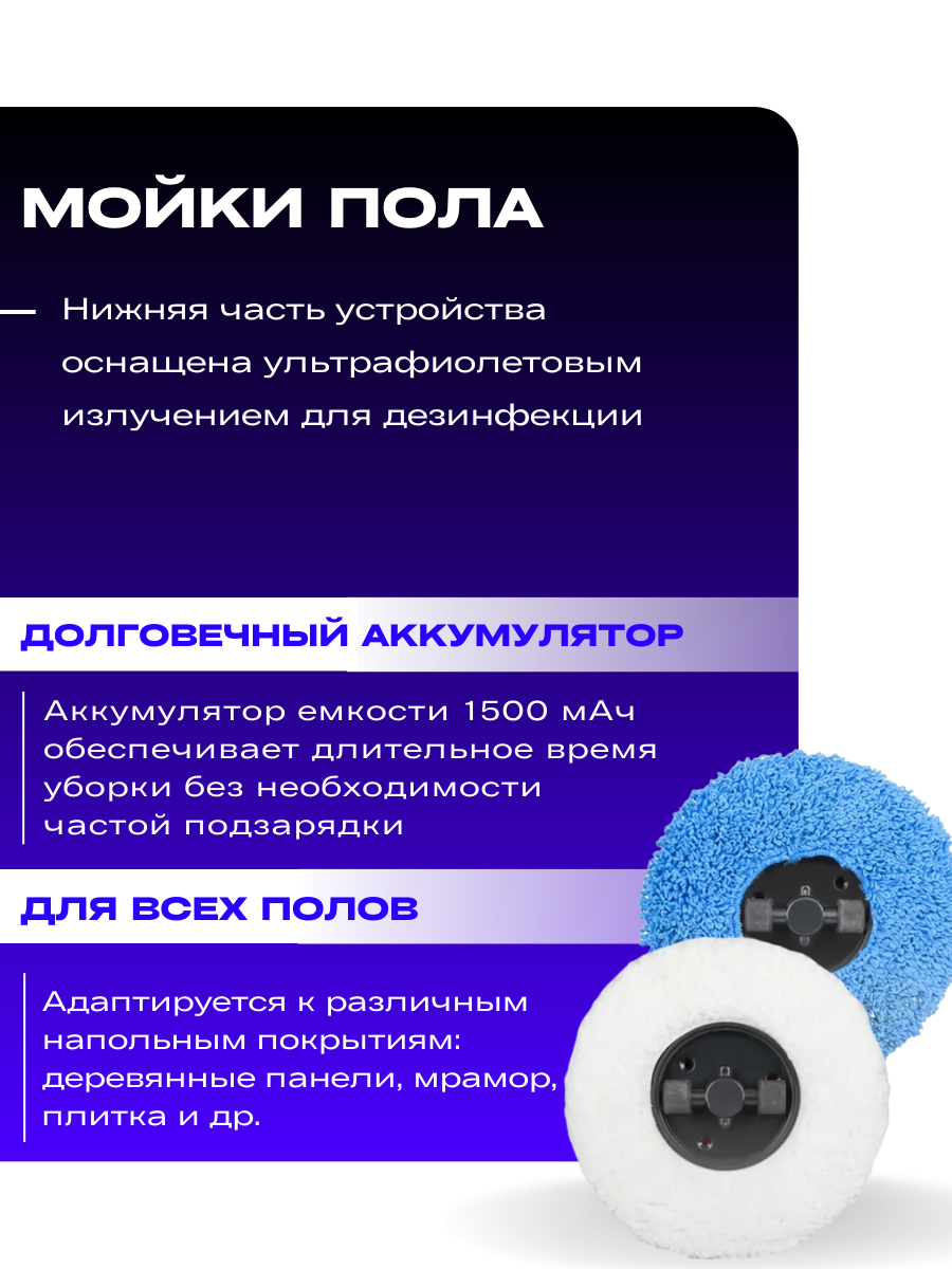 | В комплекте | зарядное устройство, универсальная насадка для влажной уборки, универсальная насадка для сухой уборки |