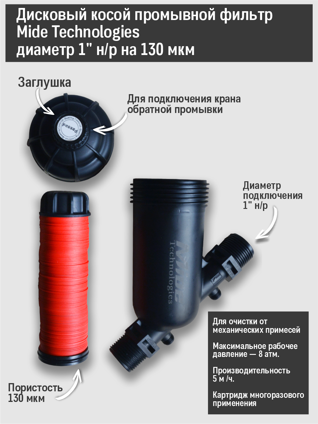 Дисковый косой промывной многоразовый фильтр диаметр 1" дюйм Н/Р на 130 мкм Mide Technologies (Тайвань) информация: