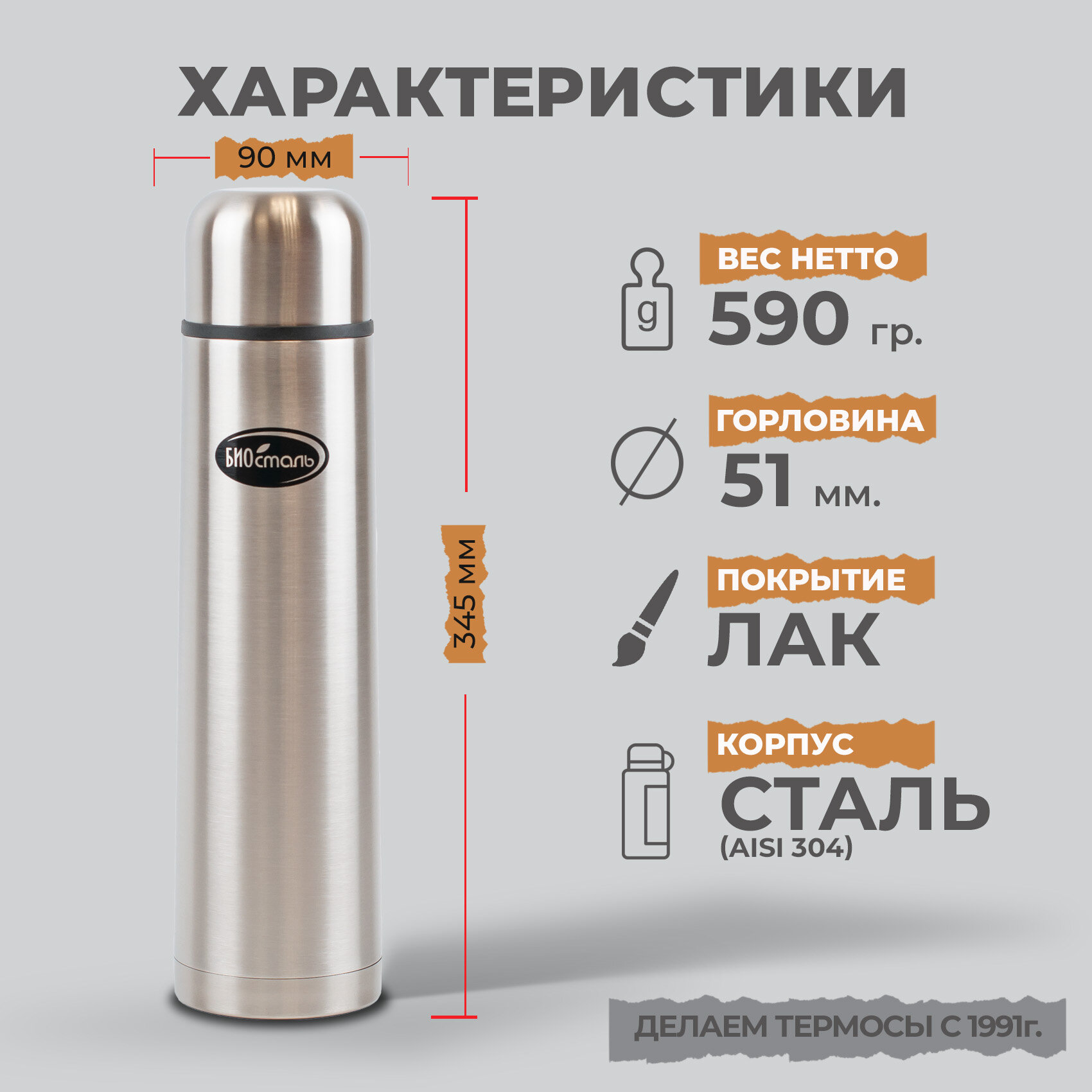 Термос универсальный (для еды и напитков) Biostal (0,6 литра) стальной, стальной