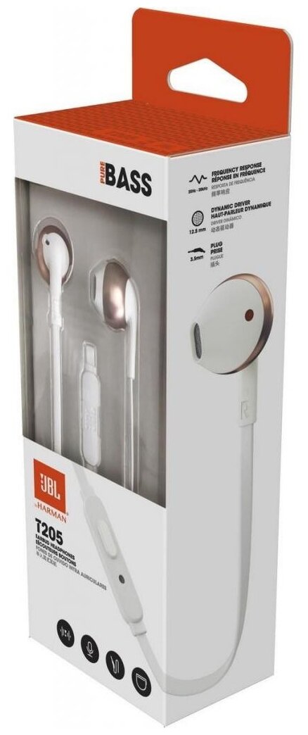 Наушники проводные с микрофоном JBL T205, проводная гарнитура, white gold