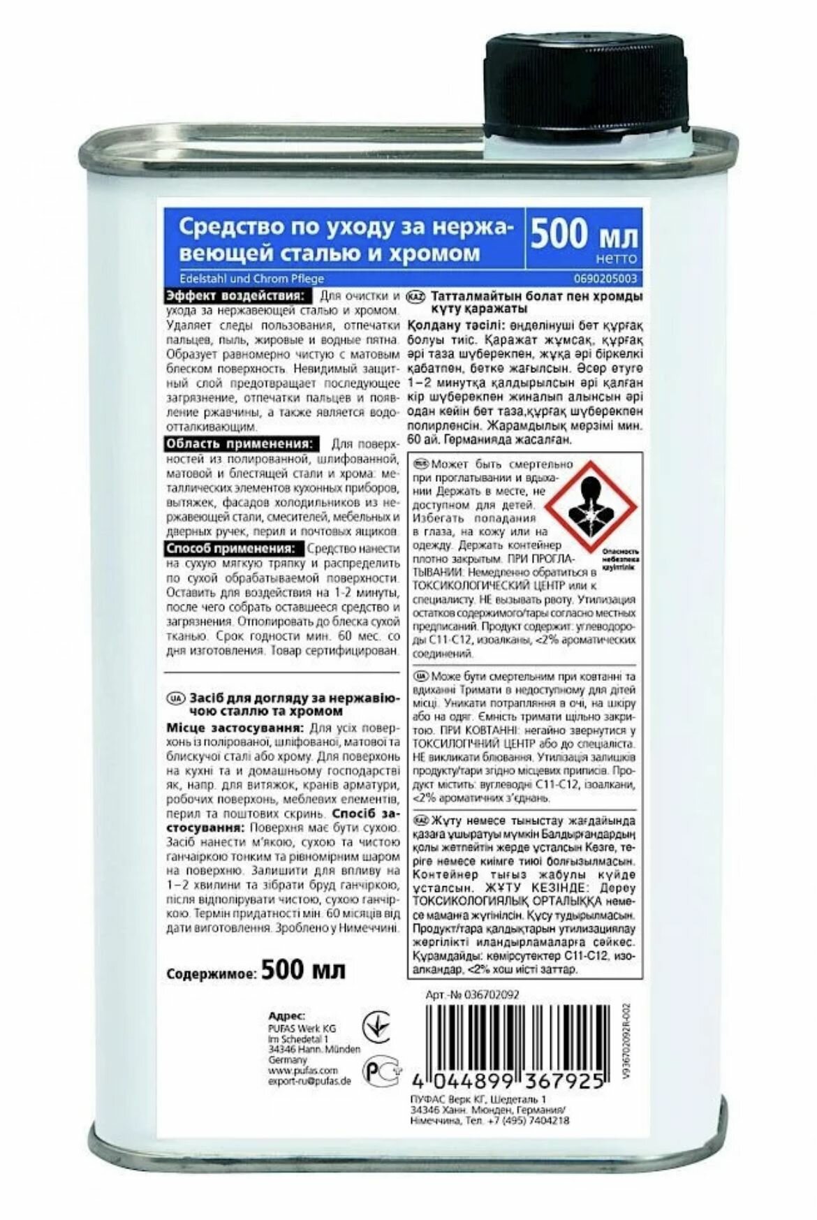 Средство по уходу за нержавеющей сталью и хромом Glutoclean Pufas 500 мл информация: