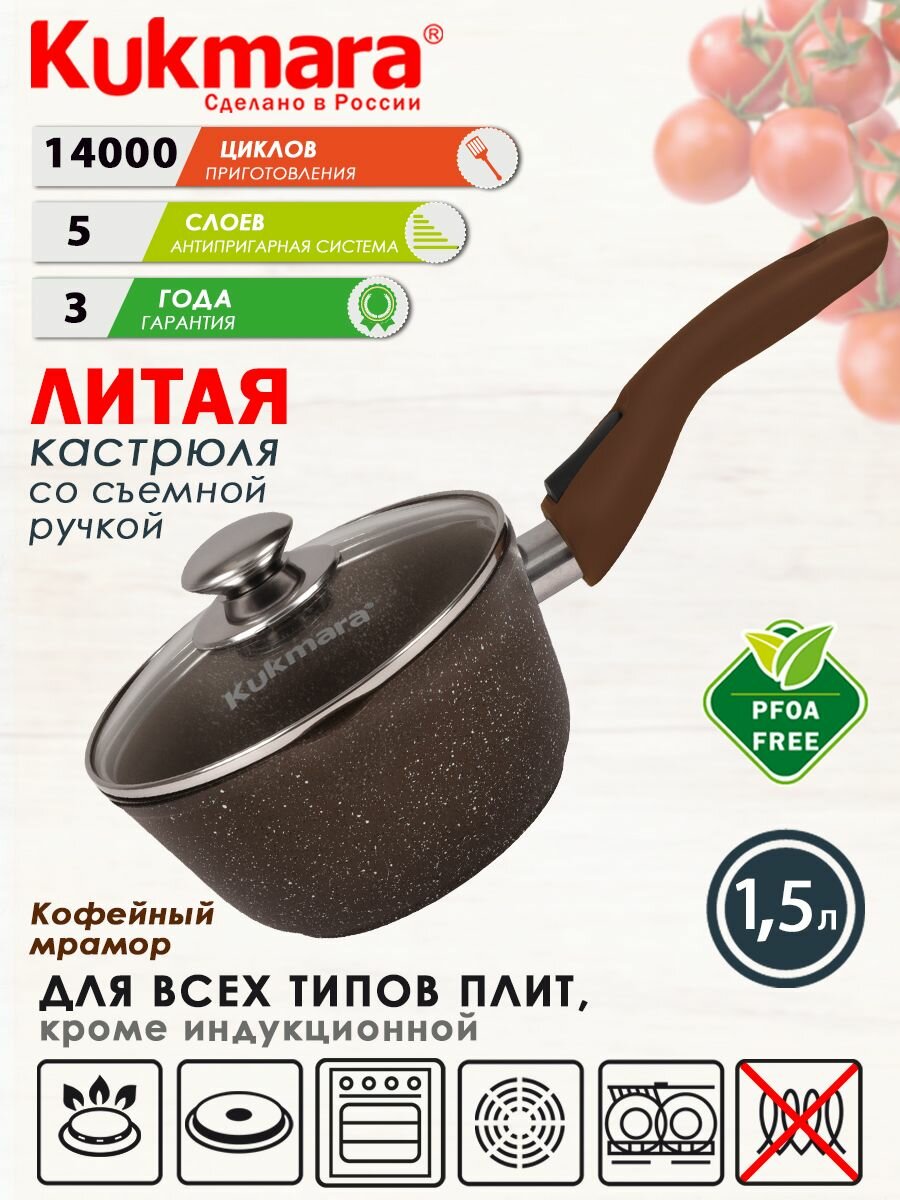 Кастрюля с антипригарным покрытием со стеклянной крышкой со съемной ручкой Kukmara (Cветлый мрамор) кмс17а, 1,5 л