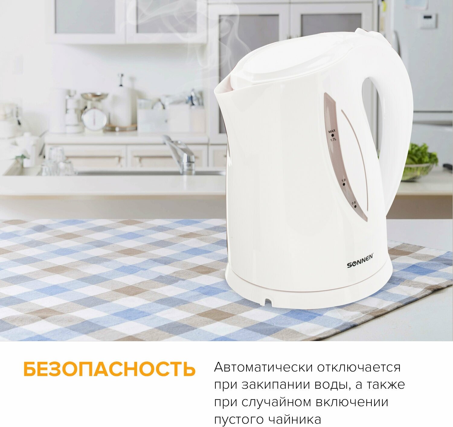 Чайник SONNEN KT-1758, 1,7 л, 2200 Вт, закрытый нагревательный элемент, пластик, белый, 453415