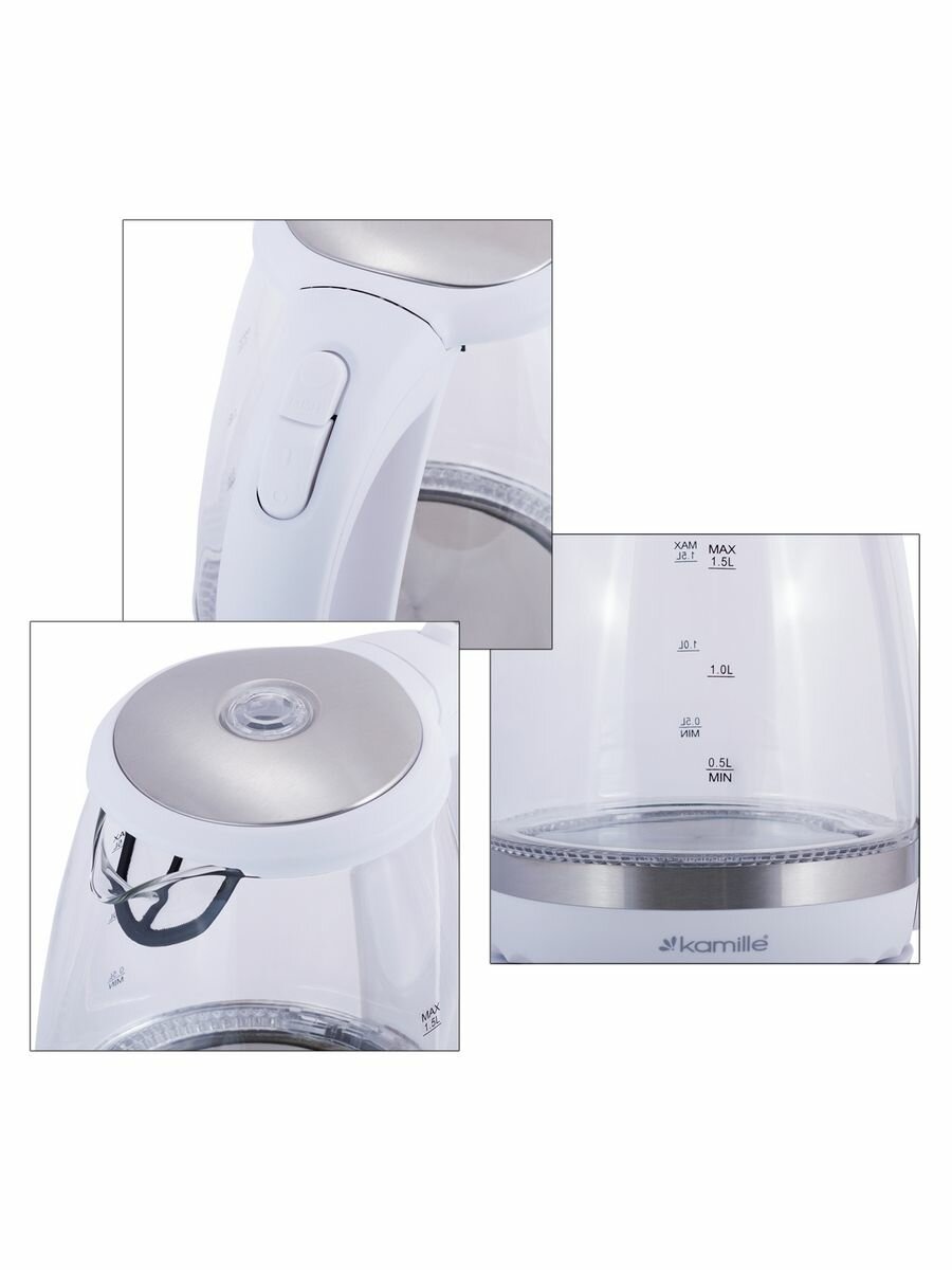 Чайник электрический 1,5 л. стеклянный Kamille KM-1700B (черный) с синей LED подсветкой (6)