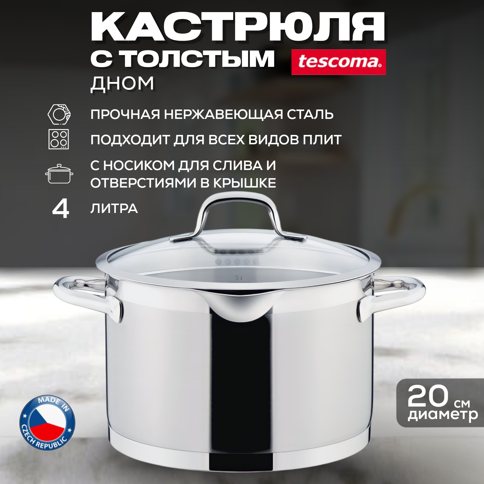 Кастрюля Tescoma President с крышкой для сцеживания o 20 см 4,0 л . информация: