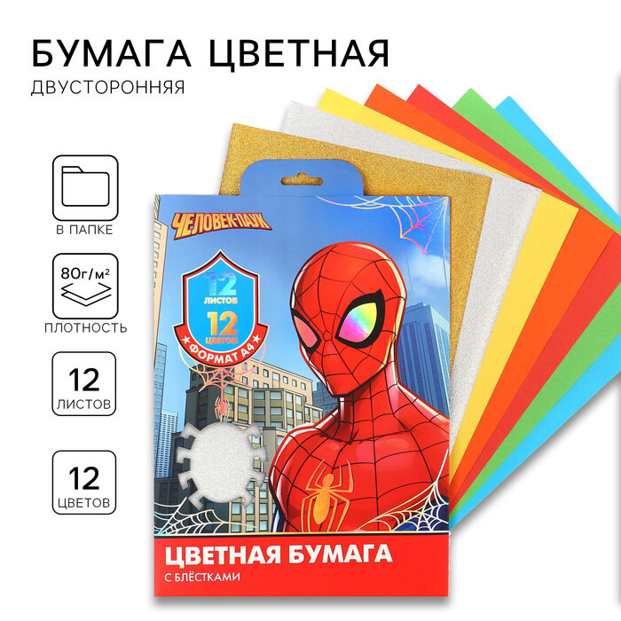 10 цен на Бумага цветная с блестками, А4, 12 листов, 12 цветов, немелованная, двусторонняя, в папке, 80 г/м², Человек-паук