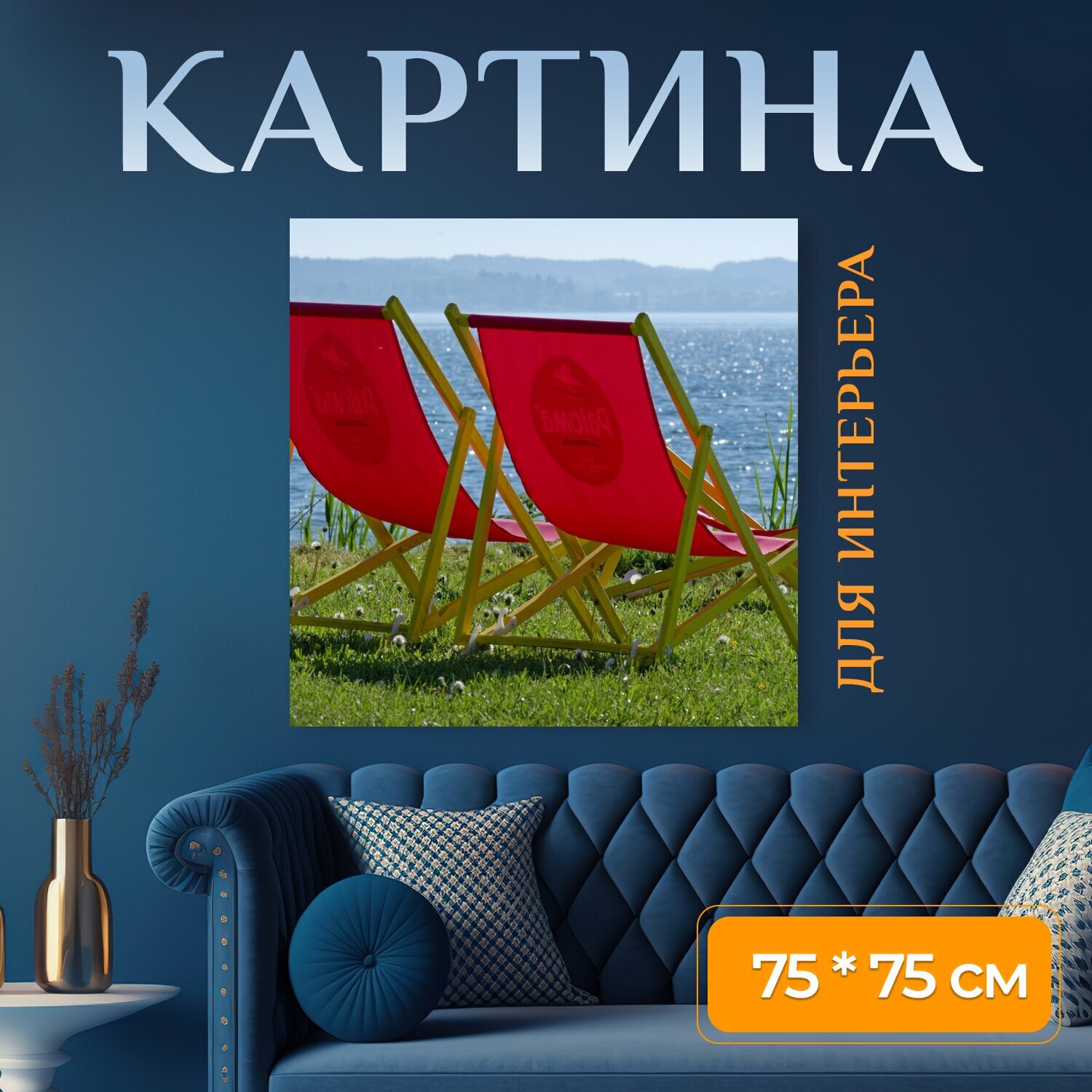 10 цен на Картина на холсте "Шезлонг, вода, озеро" на подрамнике 75х75 см. для интерьера