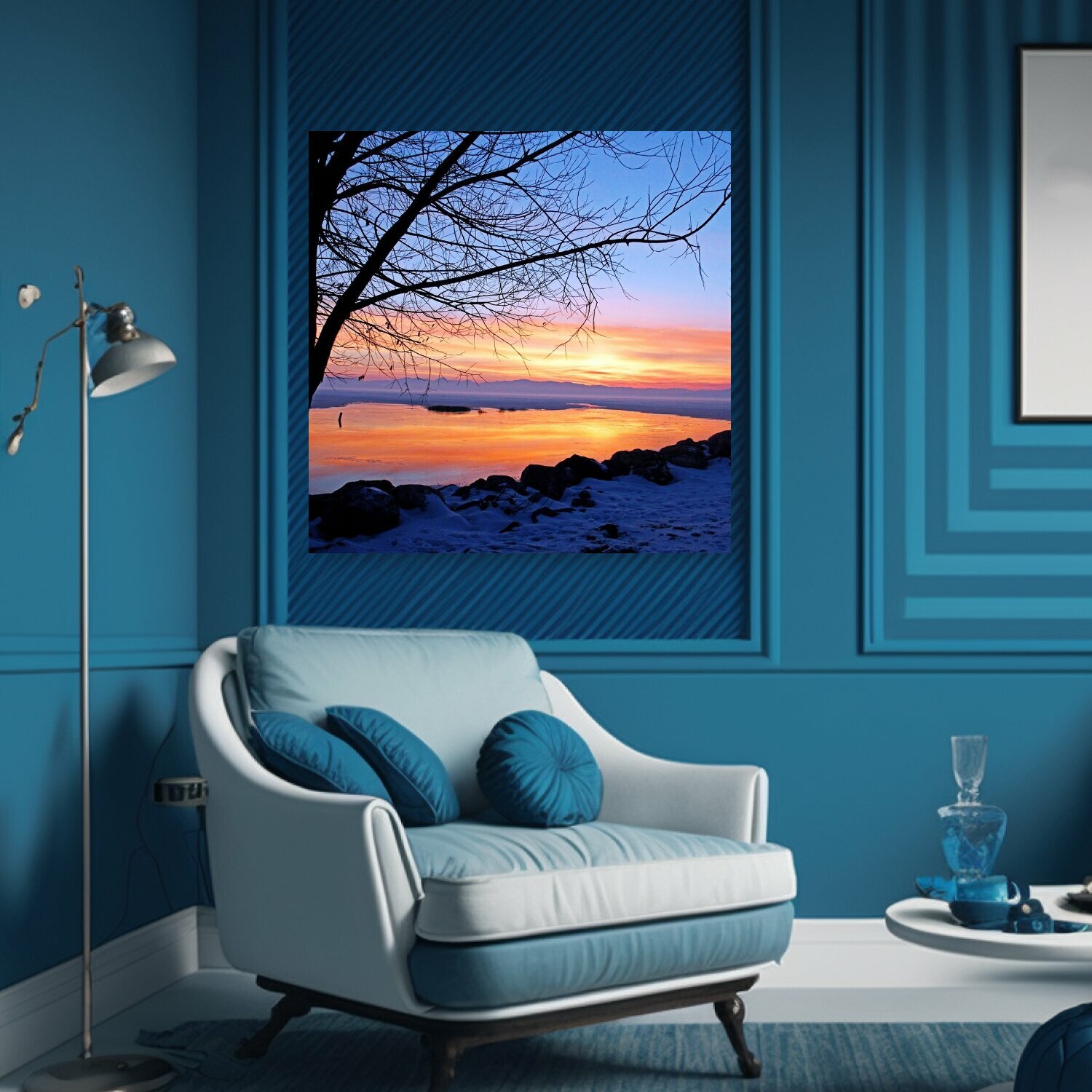 10 цен на Картина на холсте "Заход солнца, озеро, вода" на подрамнике 75х75 см. для интерьера