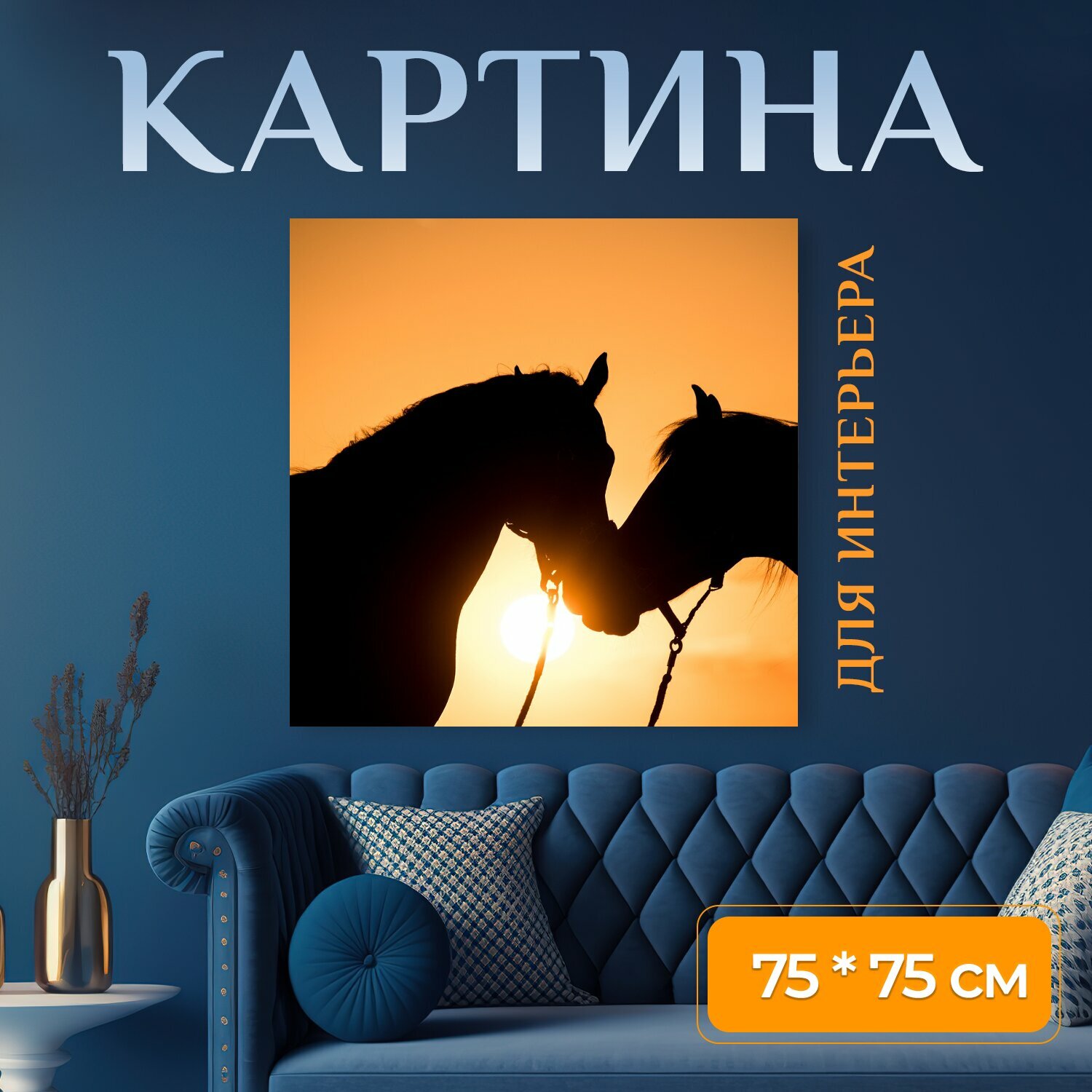 10 цен на Картина на холсте "Лошади, силуэты, заход солнца" на подрамнике 75х75 см. для интерьера