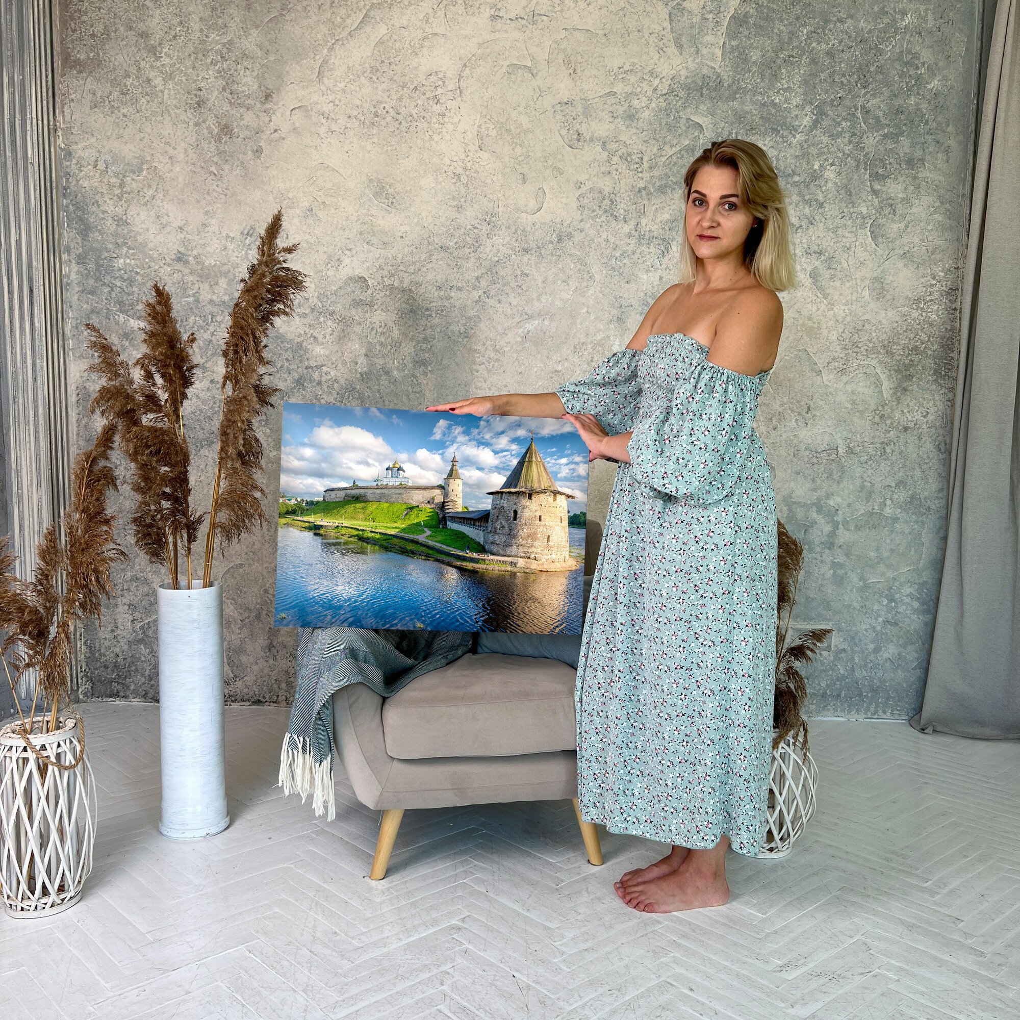 10 цен на Картина на холсте "Большой замок, расположенный на вершине пышного зеленого склона холма" 50x70 см. Интерьерная, на стену.