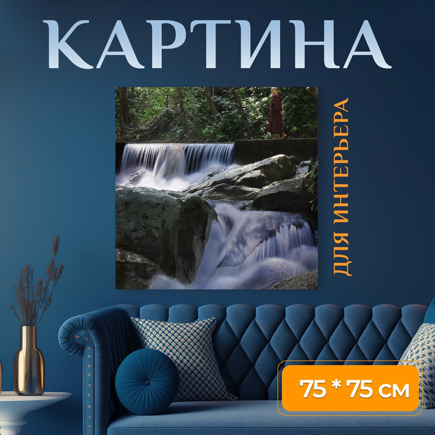 10 цен на Картина на холсте "Буддизм тхеравады, медитация при ходьбе, монах" на подрамнике 75х75 см. для интерьера