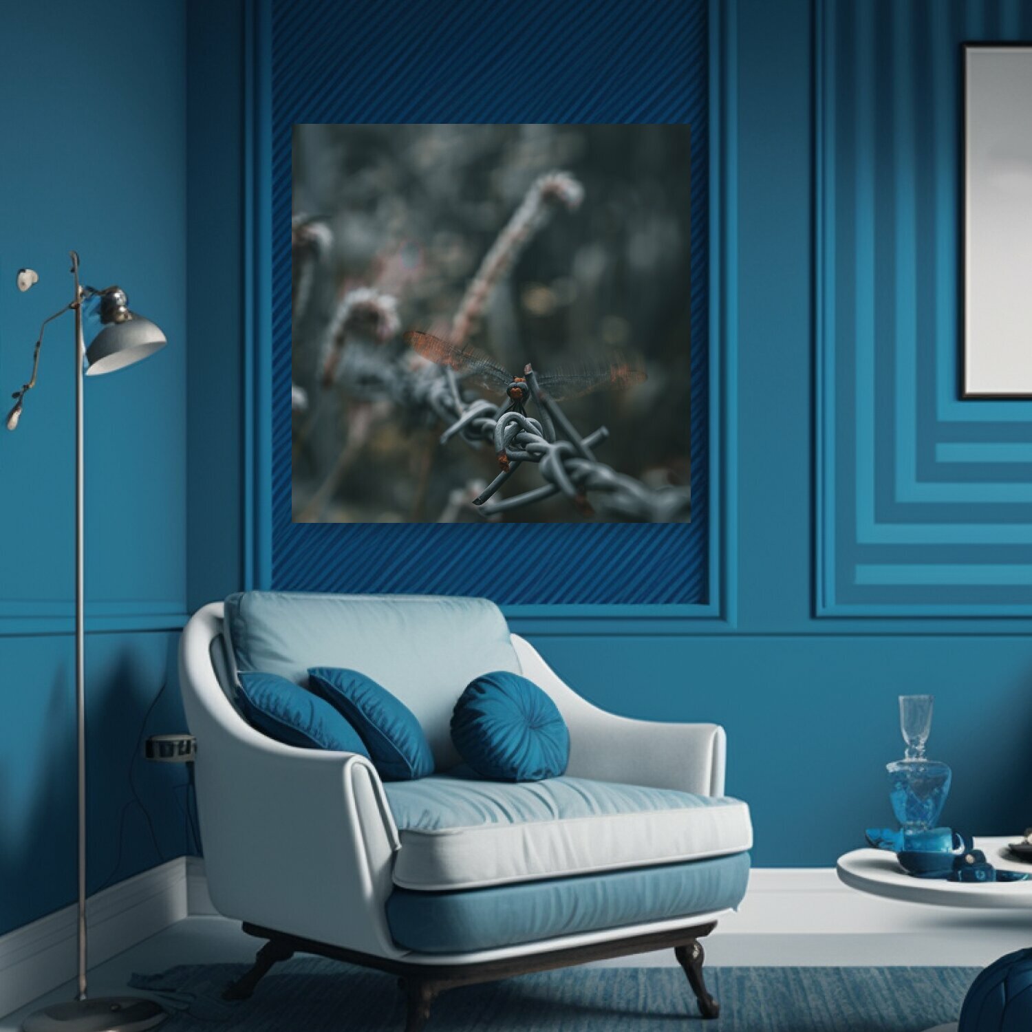 Картина на холсте "Стрекоза, насекомое, колючая проволока" на подрамнике 75х75 см. для интерьера информация: