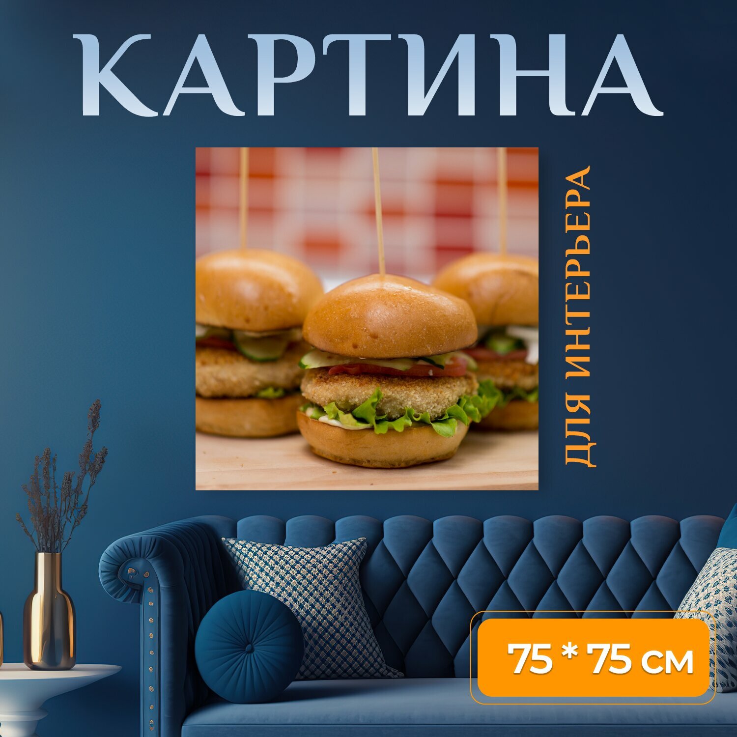 10 цен на Картина на холсте "Гамбургер, пэтти, булочки" на подрамнике 75х75 см. для интерьера