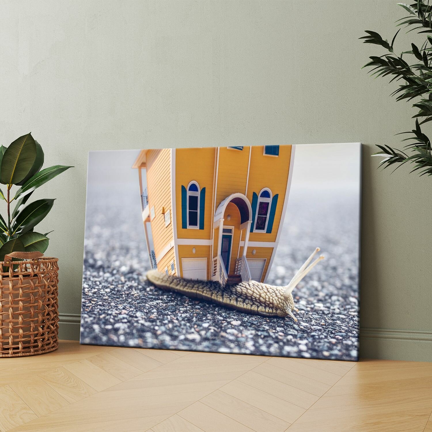 10 цен на Картина на холсте (Небольшой дом с ползущей по земле улиткой) 40x60 см. Интерьерная, на стену.