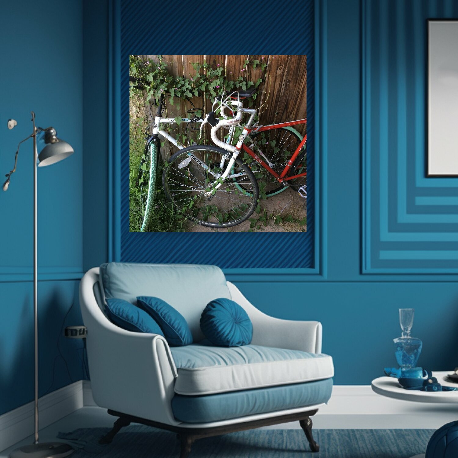 10 цен на Картина на холсте "Велосипед, лоза, заросший" на подрамнике 75х75 см. для интерьера