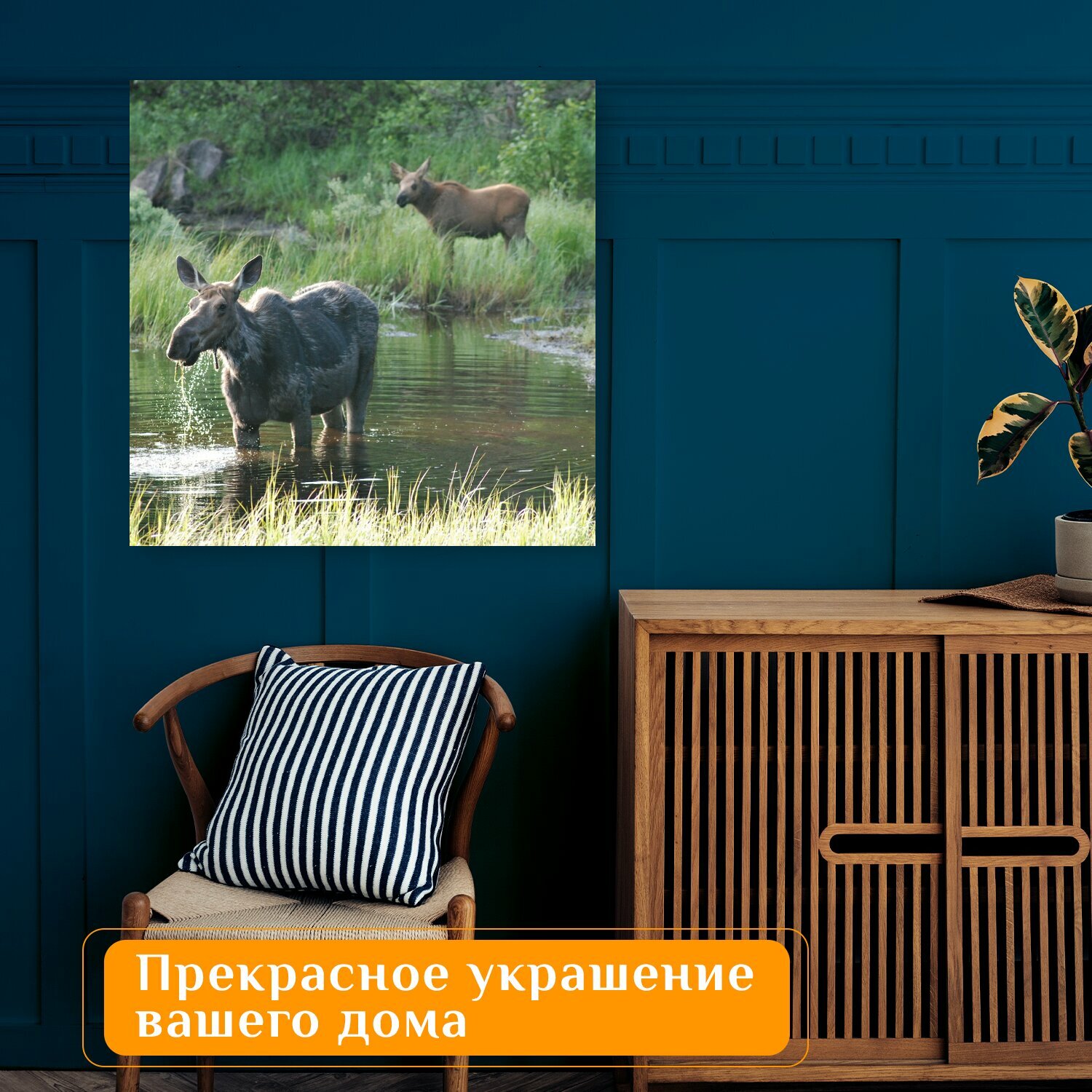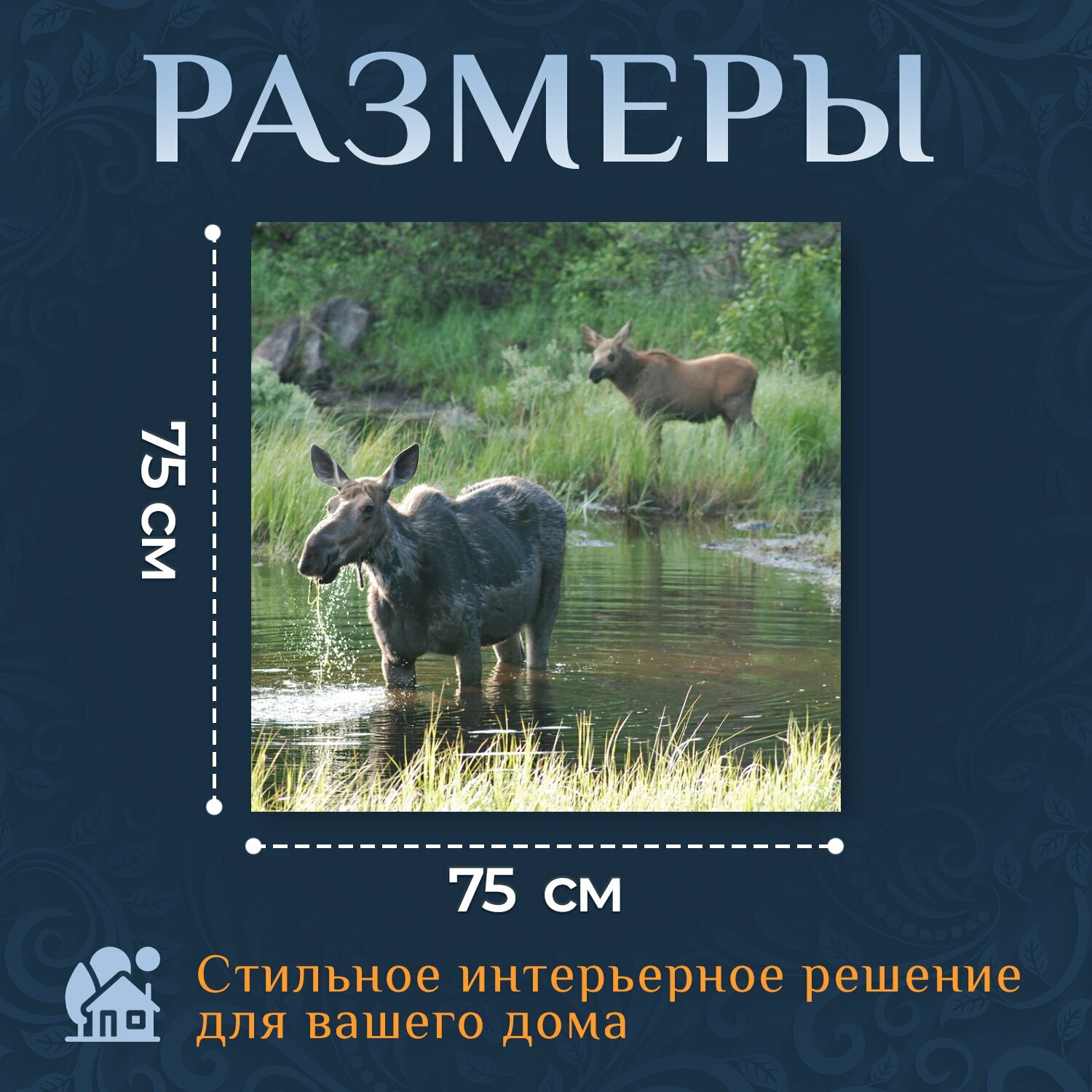 Картина на холсте "Лось, лось и детеныш, мокрый" на подрамнике 75х75 см. для интерьера информация: