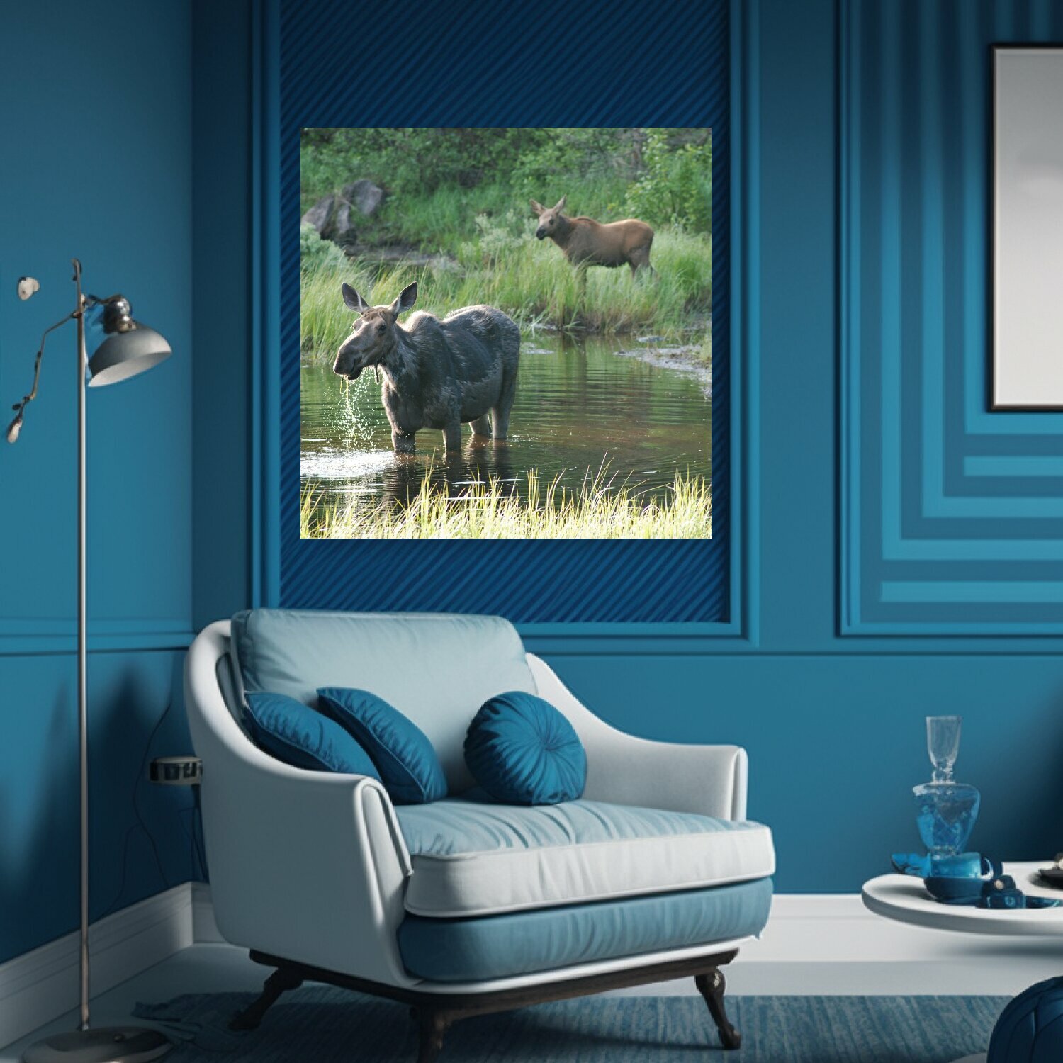 10 цен на Картина на холсте "Лось, лось и детеныш, мокрый" на подрамнике 75х75 см. для интерьера