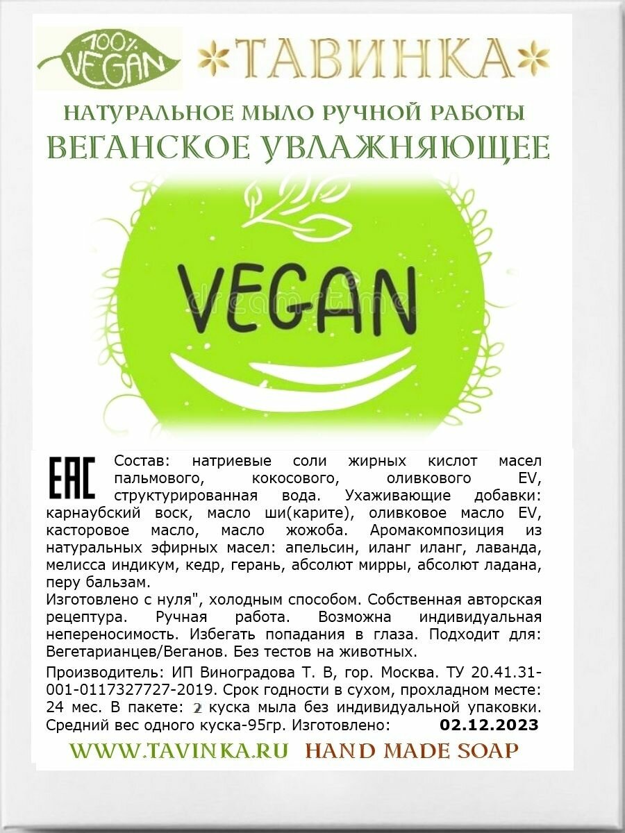 Мыло Тавинка "Веганское Увлажняющее" натуральное ручной работы - упаковка: 2 куска мыла по 95 гр. информация: