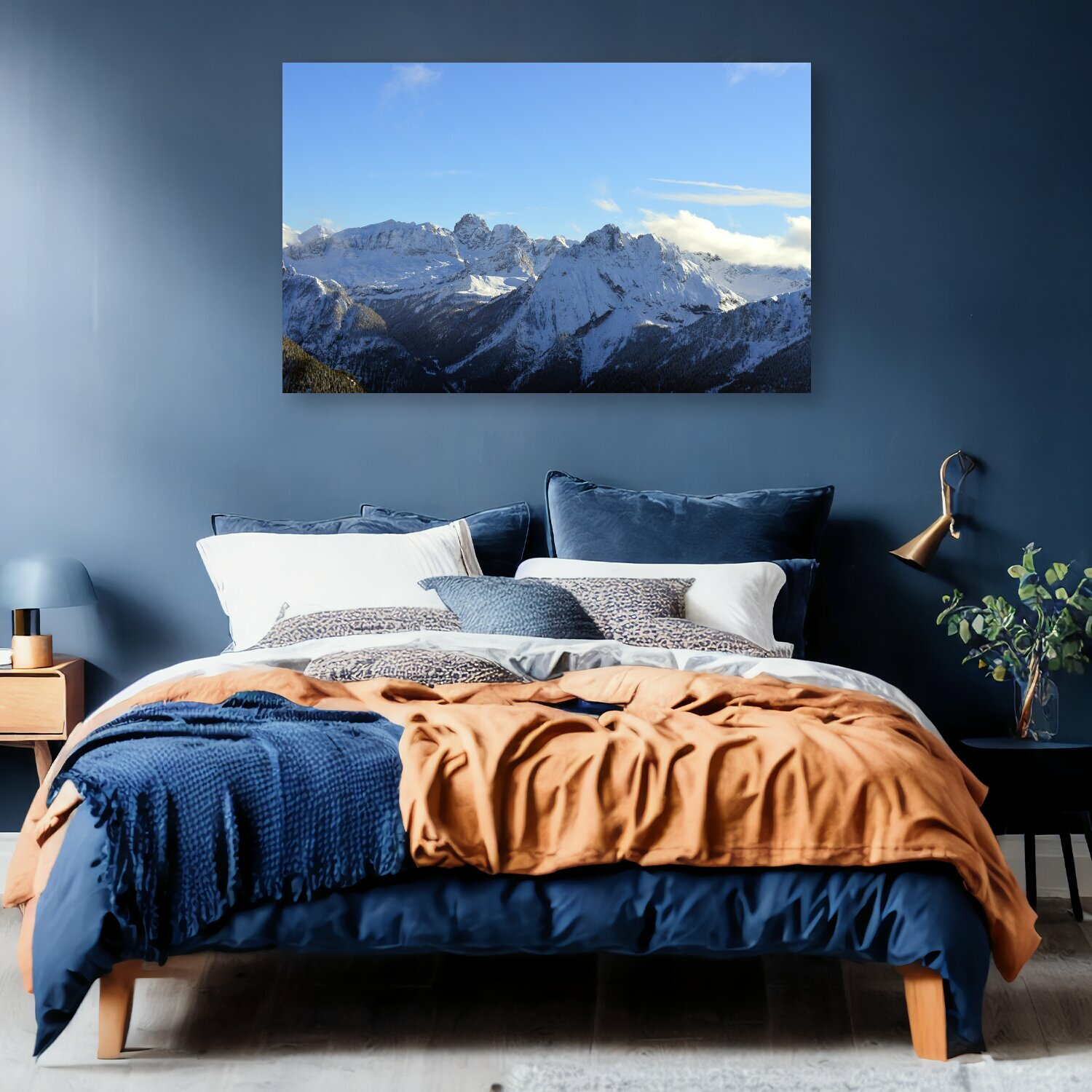 10 цен на Картина на холсте "Снег, гора, панорама" на подрамнике 120х75 см. для интерьера