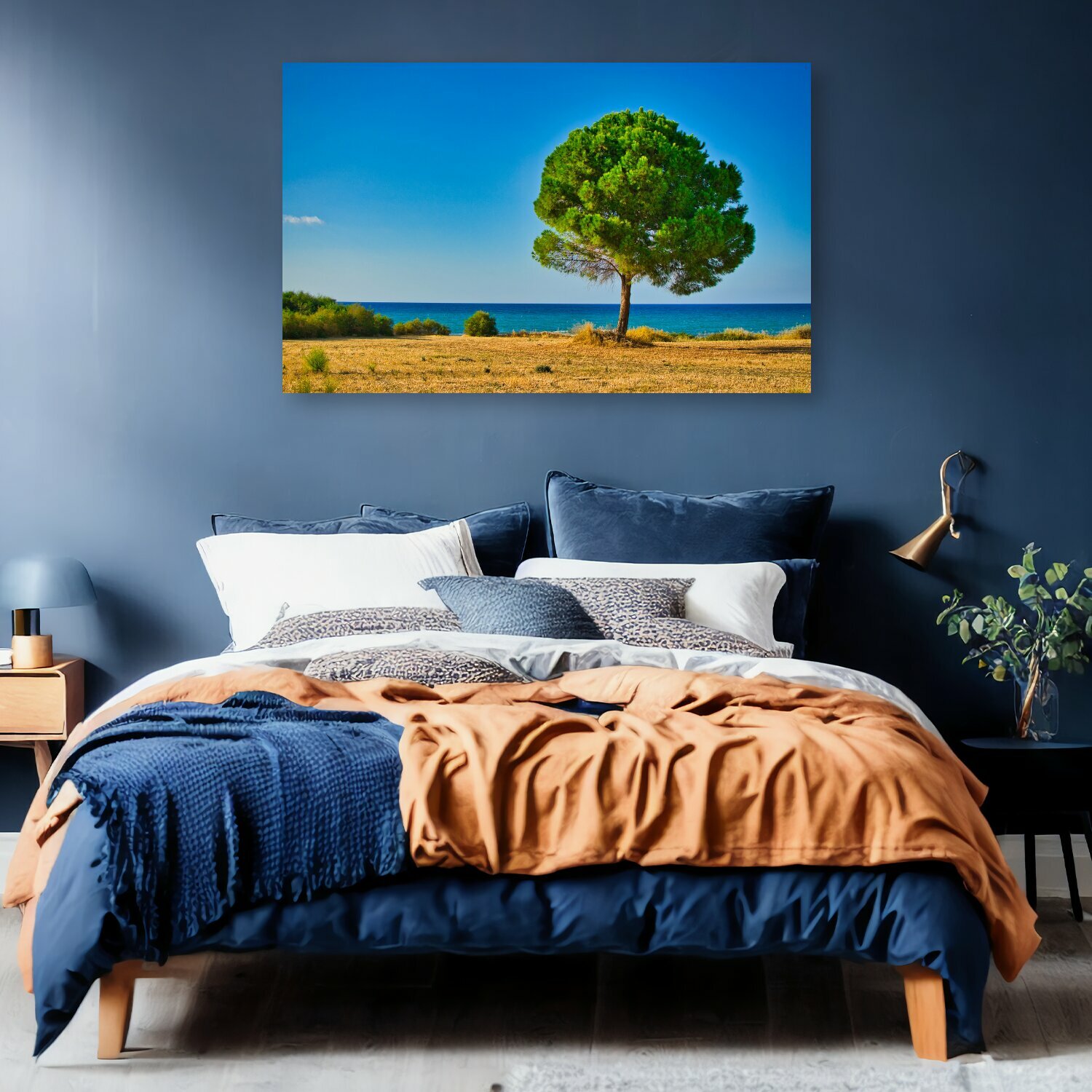10 цен на Картина на холсте "Дерево, пейзаж, море" на подрамнике 120х75 см. для интерьера