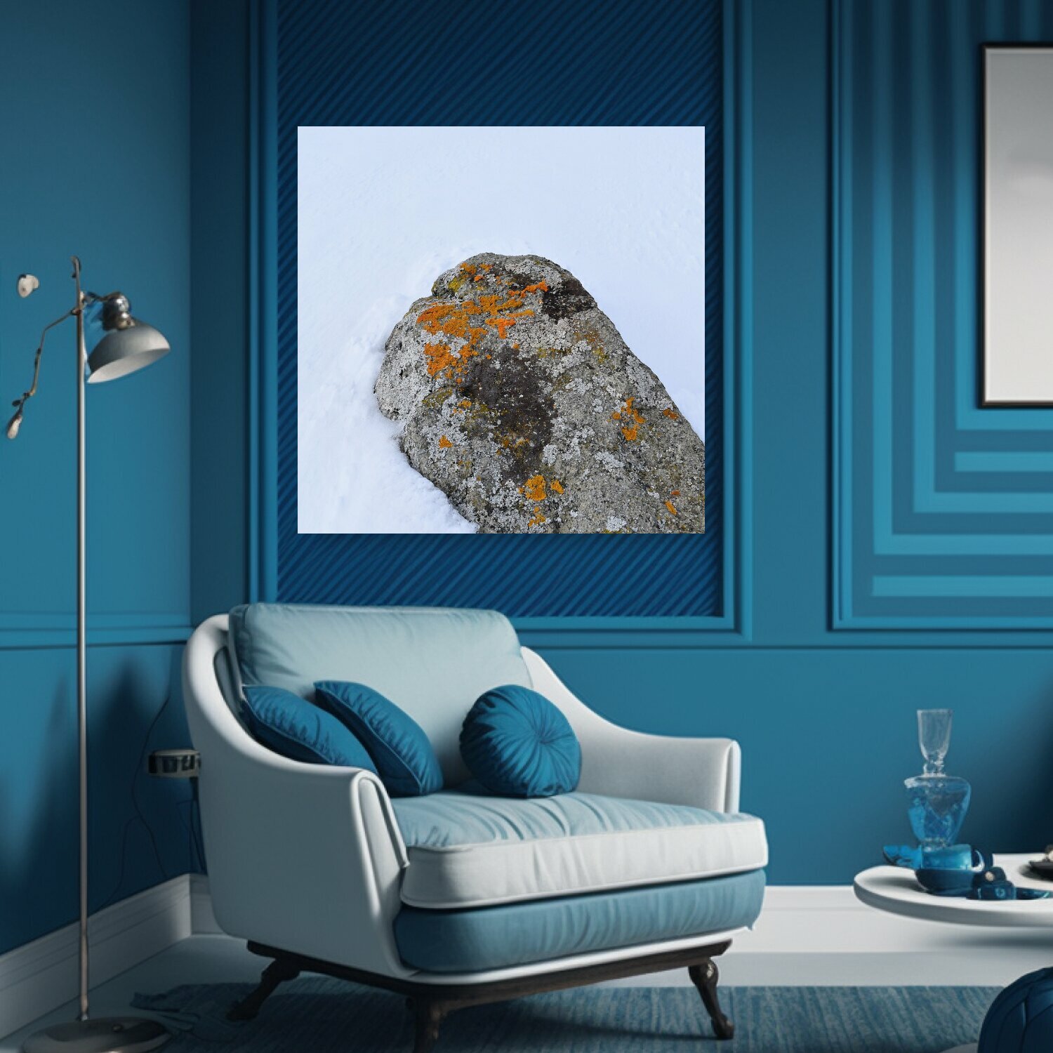 10 цен на Картина на холсте "Камень, лишайник, снег" на подрамнике 75х75 см. для интерьера