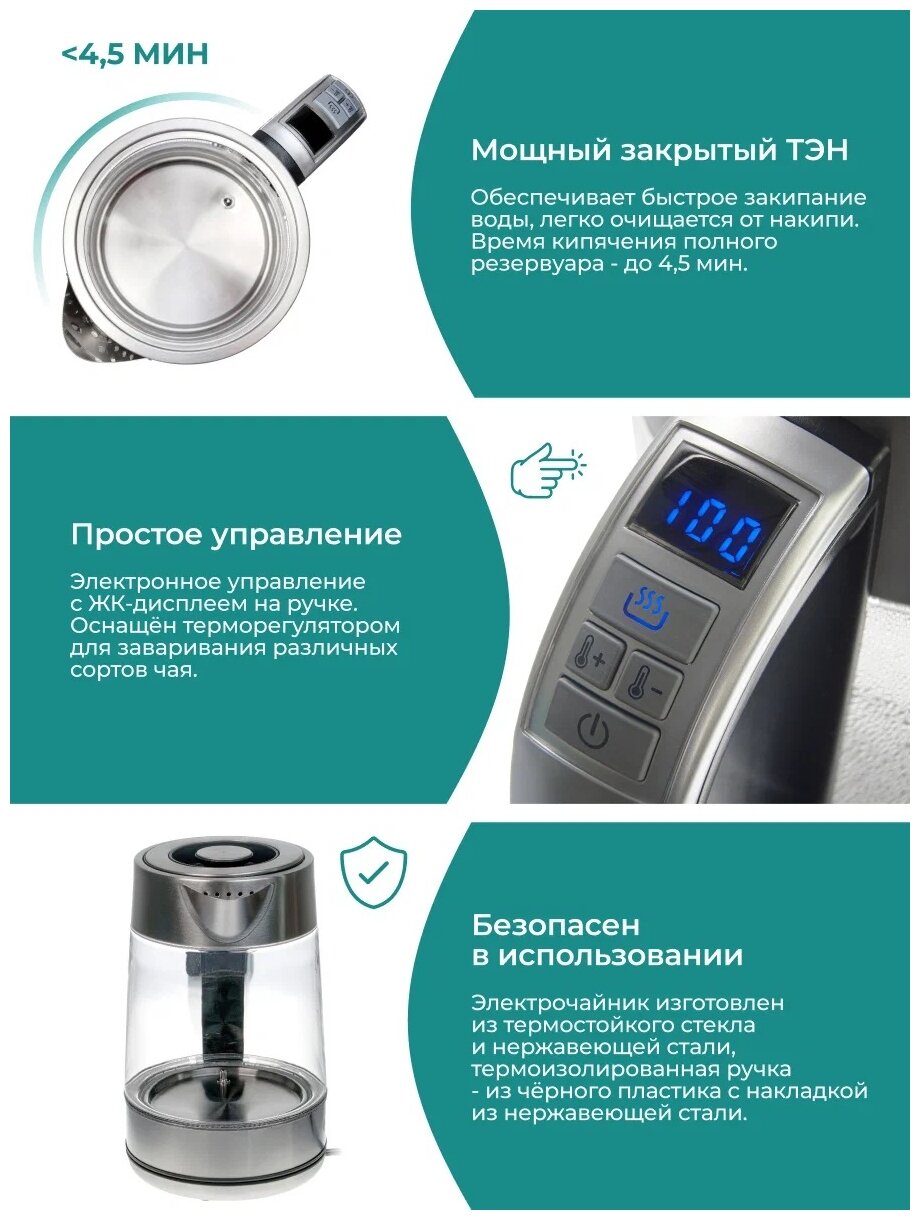 Чайник электрический стеклянный с подсветкой и температурой информация: