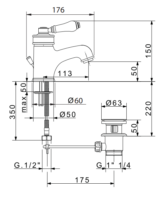 "ERMITAGE Смеситель для раковины монокомандный, ручка сверху белая, бронза"