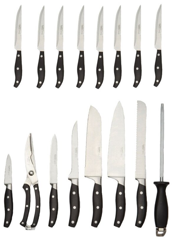 Отзывы на Набор ножей Нож сантоку BergHOFF Essentials line 1307146, 14 ножей, ножницы, 3 разделочных доски и точилка с подставкой, черный / коричневый