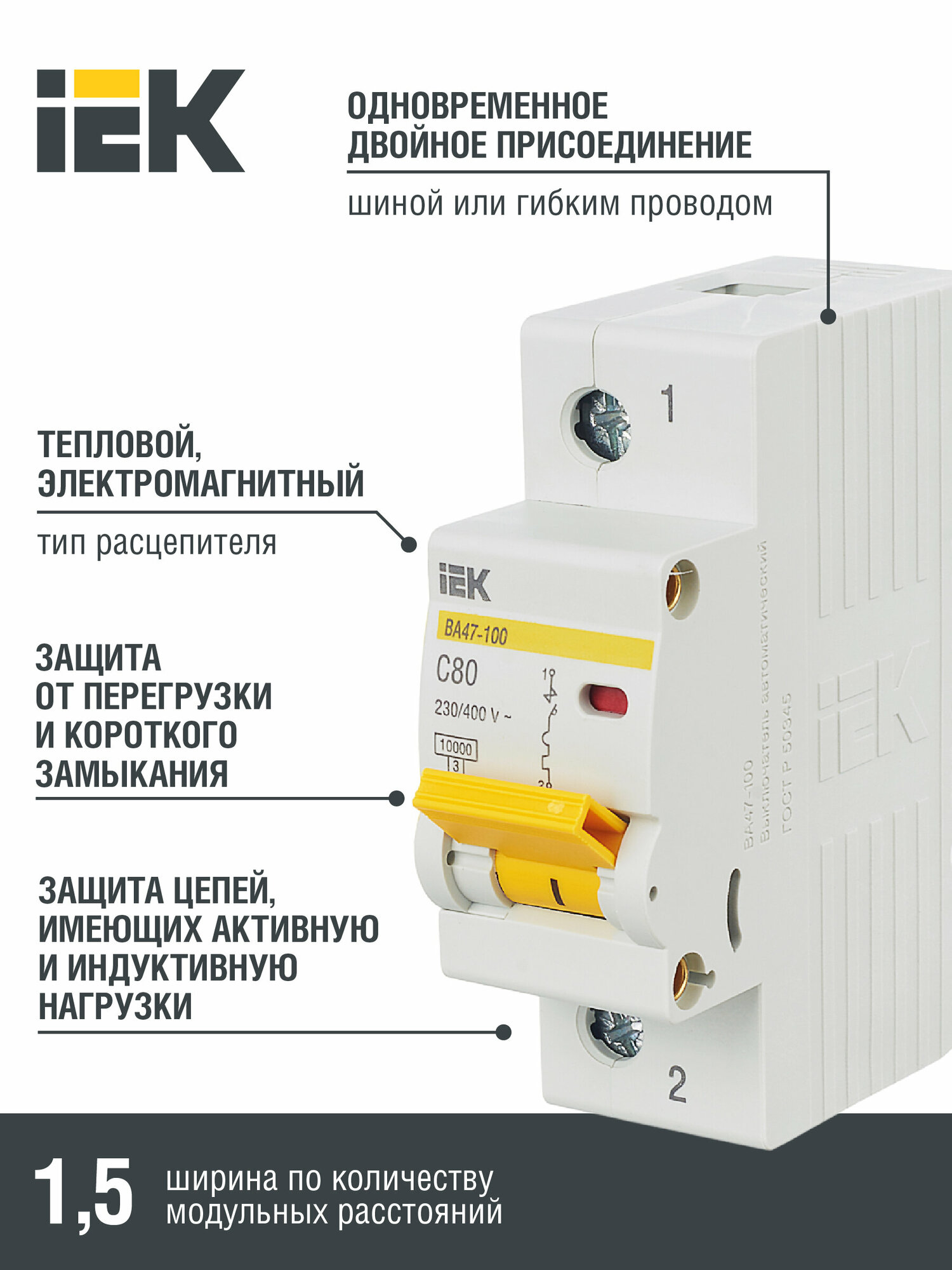 Выключатель автоматический однополюсный ВА47-100 80А C 10кА MVA40-1-080-C IEK информация: