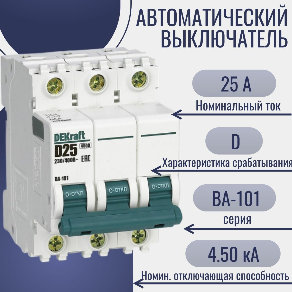 1шт. - Выключатель автоматический трехполюсный 25А D ВА-101 4.5кА / Dekraft; арт. 11128DEK; оригинал / - комплект 1шт 1 169 ₽