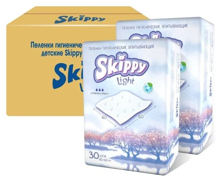 Пеленки одноразовые 60x60 Skippy Light, гигиенические впитывающие для детей, 60шт. (2 х 30шт.) информация: