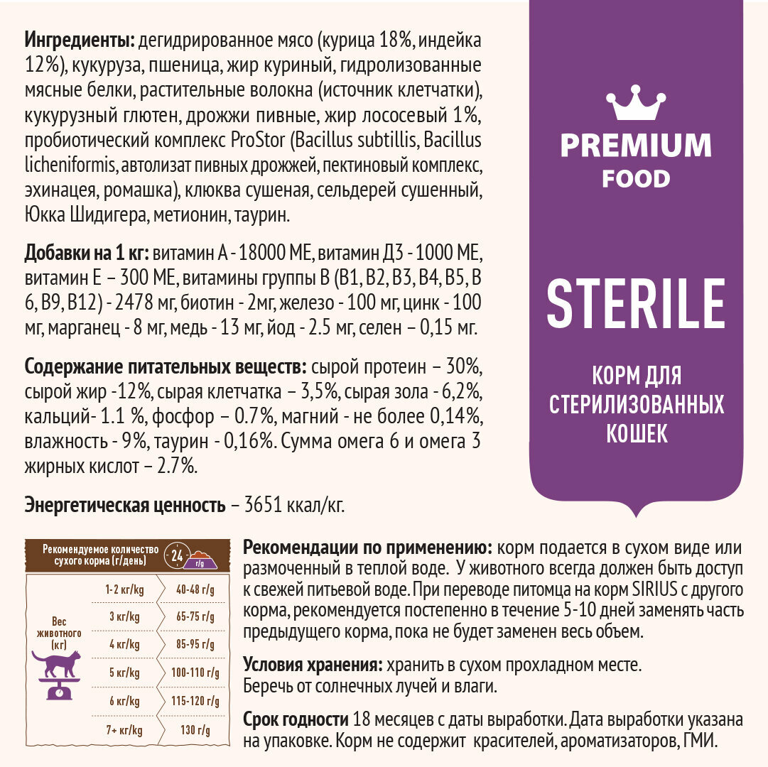SIRIUS (Сириус) сухой корм для ежедневного питания стерилизованных кошек индейка И курица 1,5 кг
