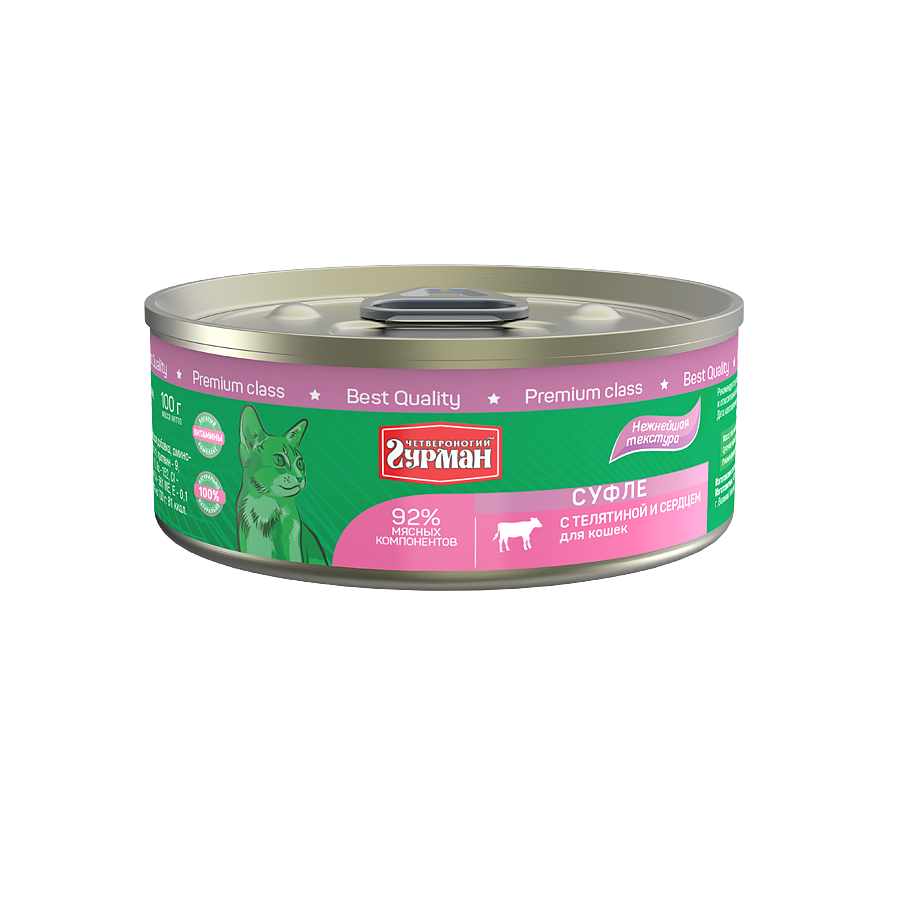 Четвероногий гурман суфле для взрослых кошек с телятиной и сердцем банка 100 гр NEW 100 гр х 6 шт 737 ₽