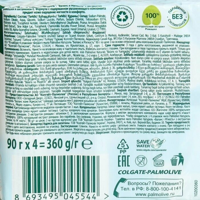 Palmolive Мыло туалетное Натурэль Баланс и мягкость, 4 х 90 г информация: