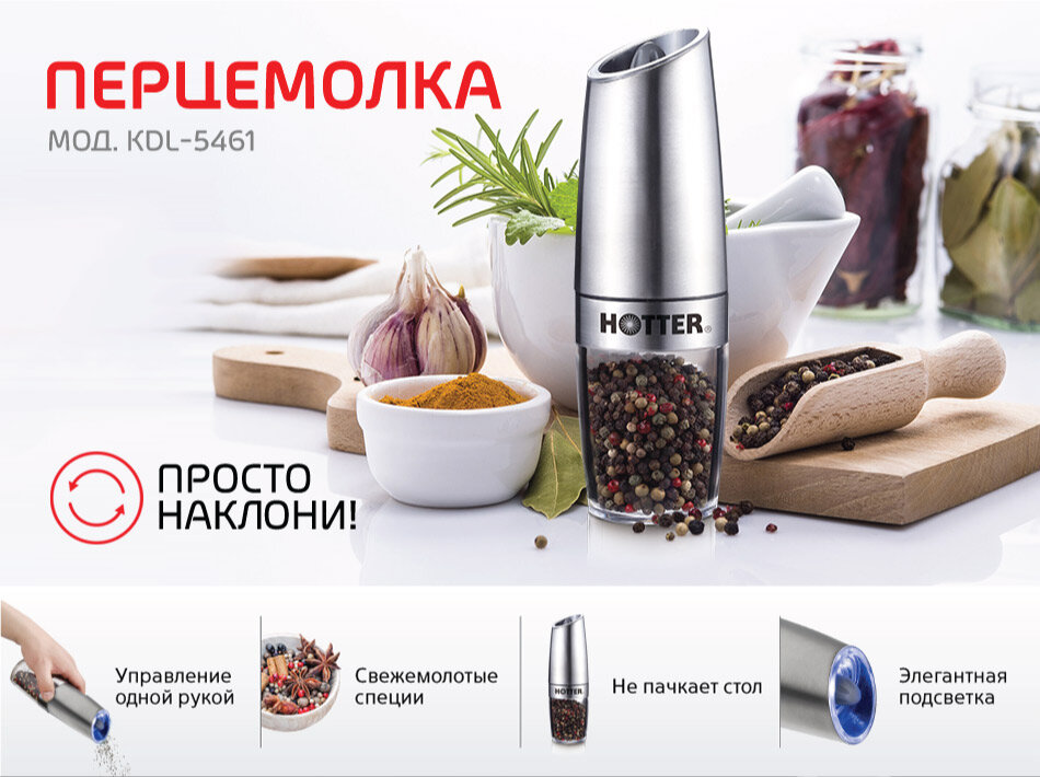Отзывы на Мельница для специй электрическая Hotter KDL-546A, серебристый/ бесцветный, 130мл., с регулировкой помола и LED-подсветкой