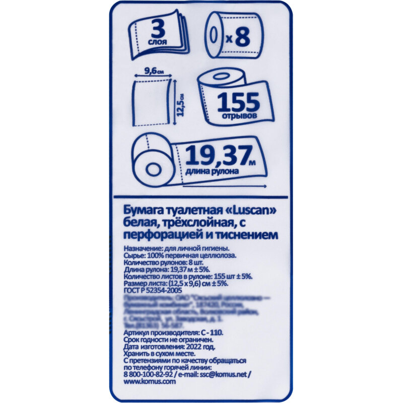 Туалетная бумага Luscan Deluxe, 3 слоя, 8 рулонов информация:
