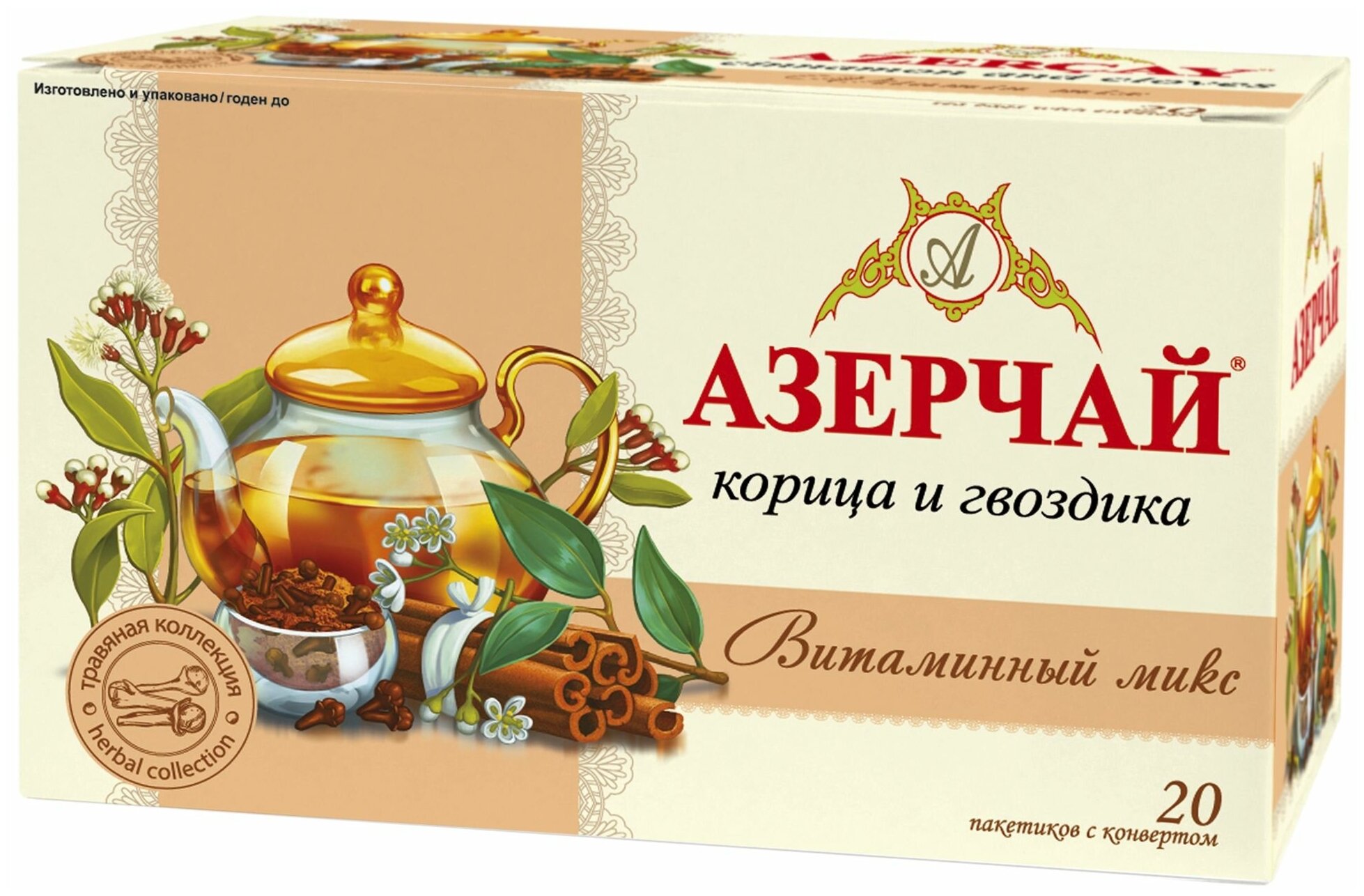 10 цен на Чай в пакетиках черный Азерчай Витаминный микс, с корицей и гвоздикой, 20 шт, в сашетах