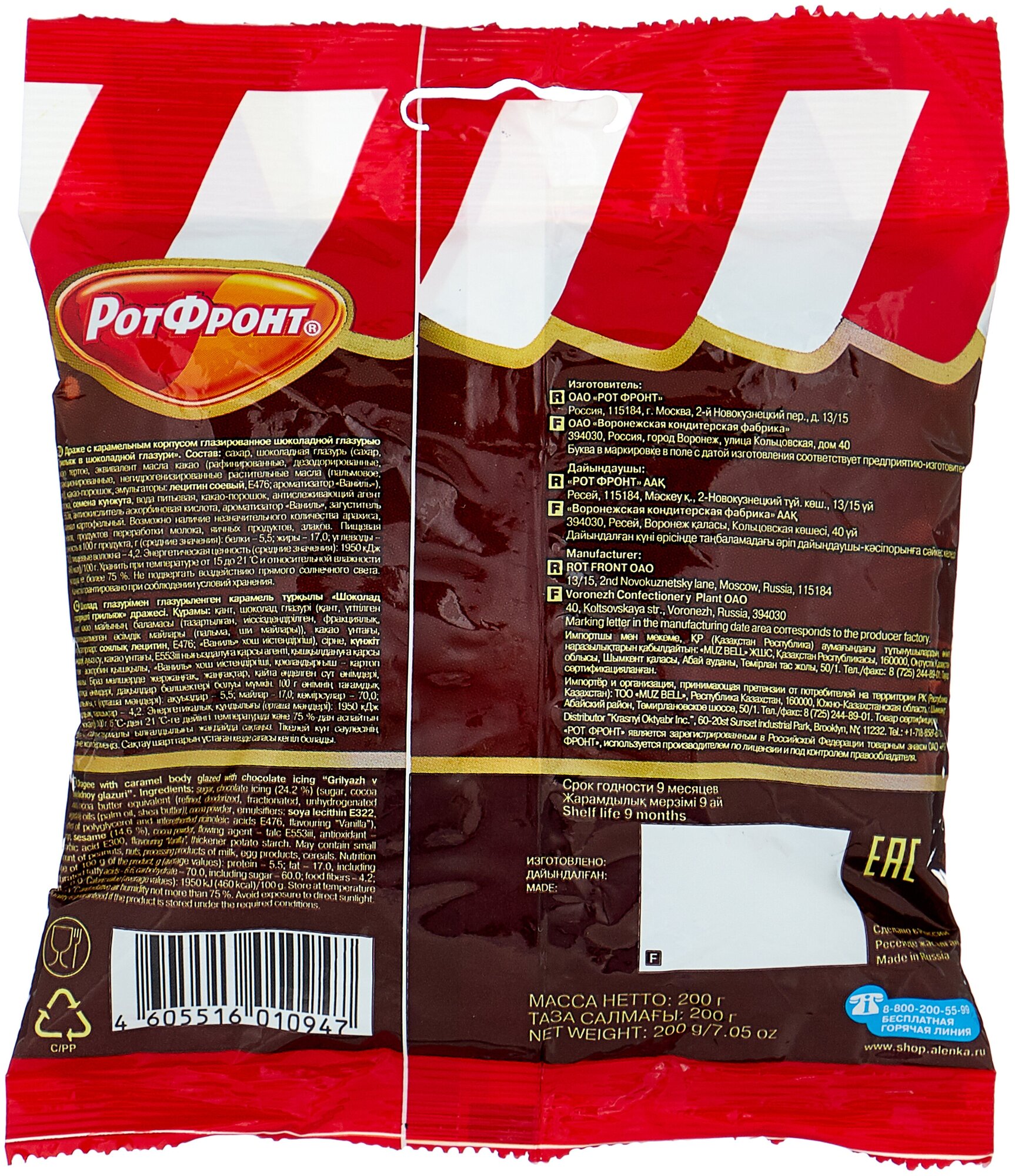 Конфеты драже Рот Фронт Грильяж в шоколадной глазури, 200г информация: