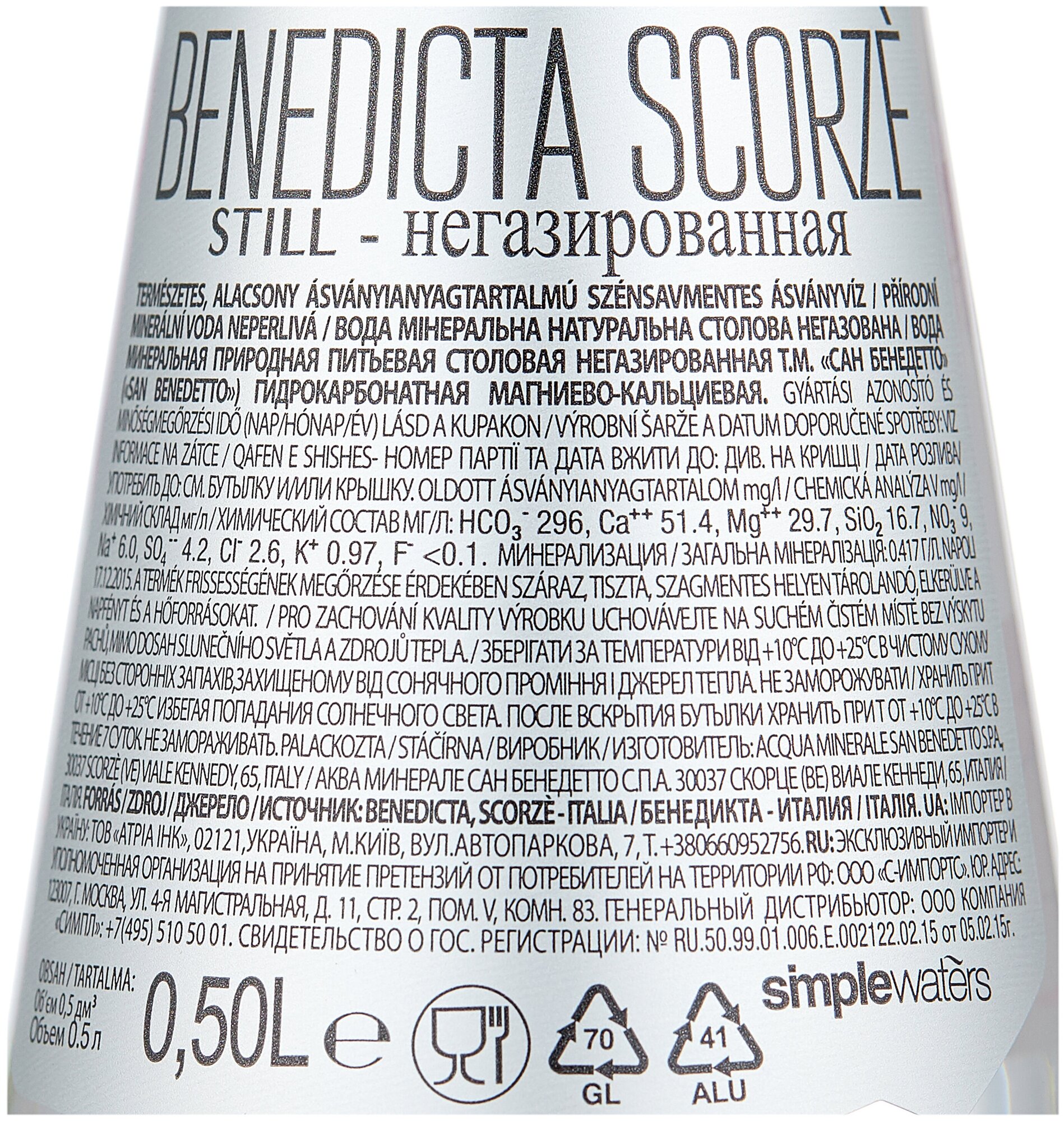 Вода минеральная San Benedetto (Сан Бенедетто) 20шт. по 0,5л, негазированная, стекло информация: