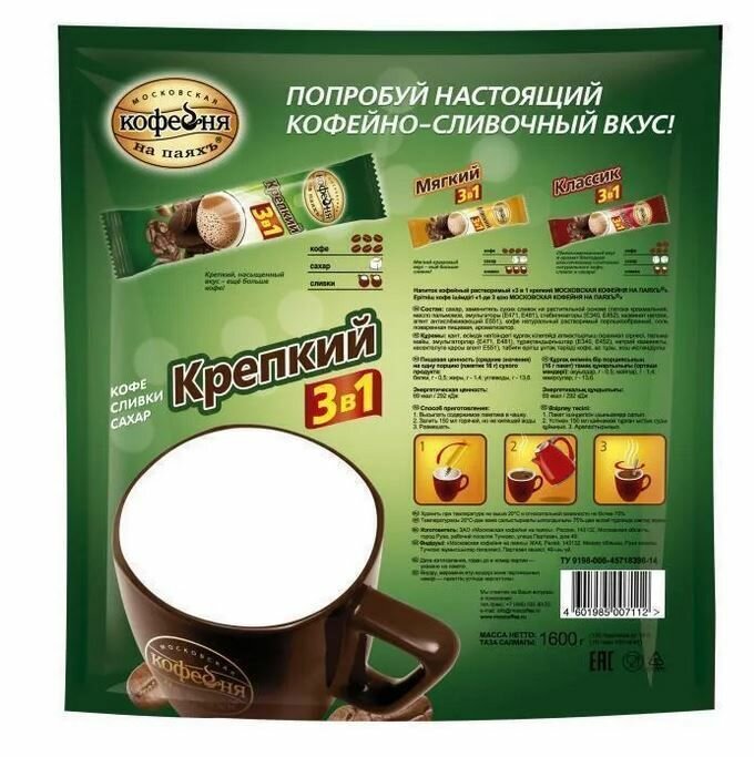 Московская кофейня на паяхъ Кофе растворимый, Крепкий 3 в 1, 100 пакетиков, 1600 г