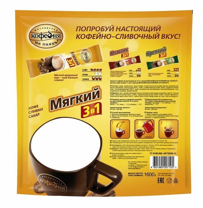 Растворимый кофе Московская кофейня на паяхъ Мягкий 3 в 1, в стиках, 100 уп., 1600 г