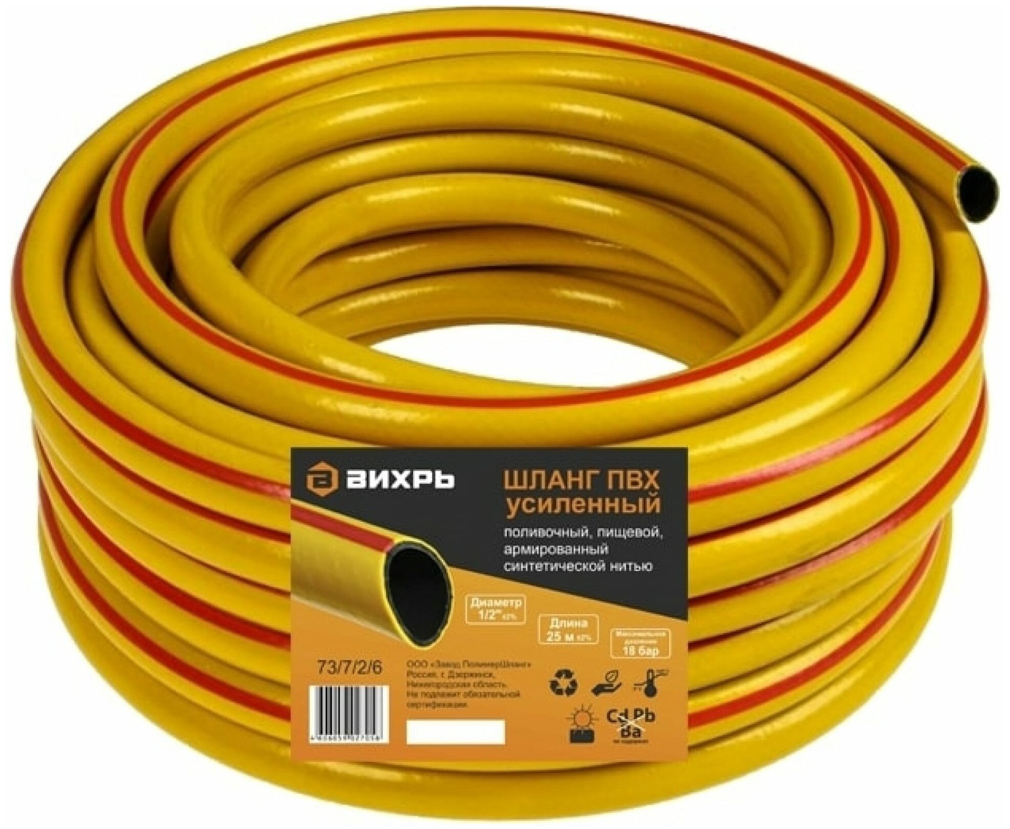 Вихрь Шланг поливочный ПВХ усиленный, пищевой трехслойный армированный 1/2, 25 м жёлтый 73/7/2/6