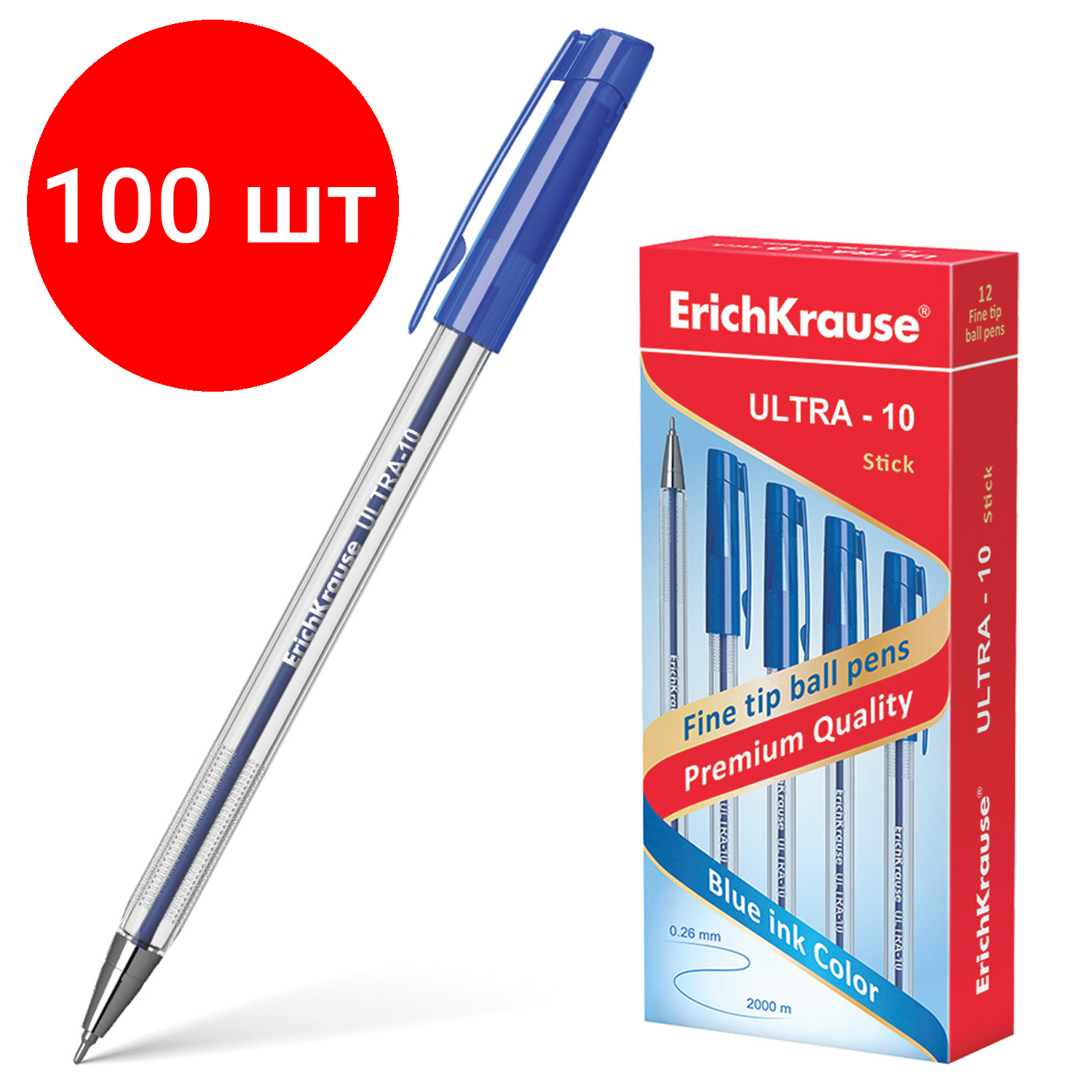 10 цен на Комплект 100 шт, Ручка шариковая масляная ERICH KRAUSE "Ultra-10", синяя, корпус прозрачный, узел 0.7 мм, линия письма 0.26 мм, 13873