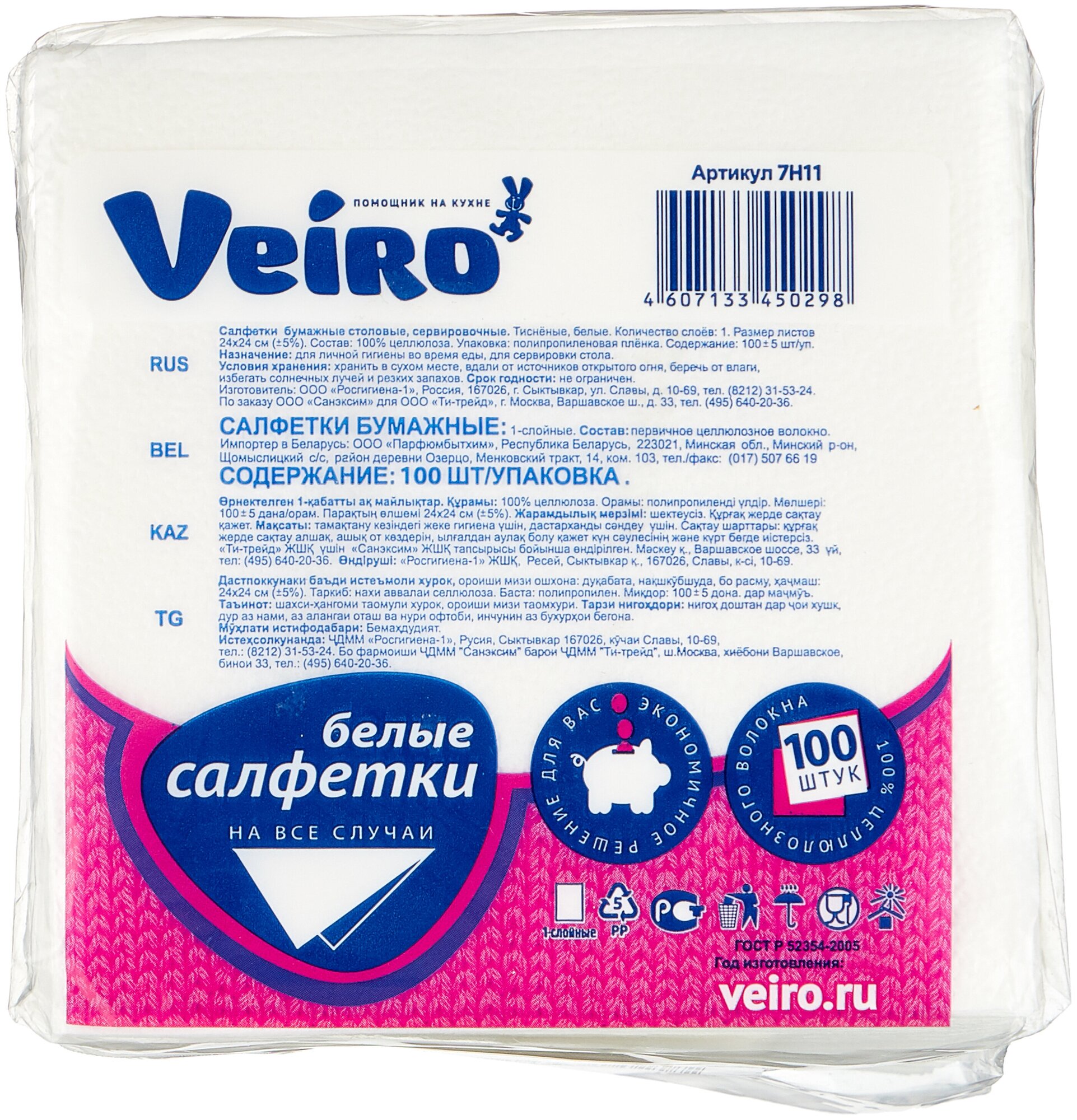 Салфетки VEIRO белые, 1-сл.,24х24 см, 100 шт./уп.24Б1/100