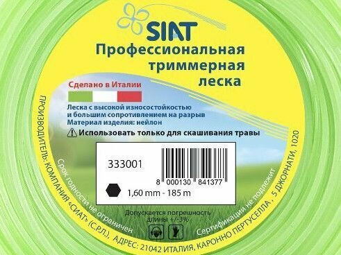 Леска для триммера 1.6 мм Шестигранник (185 м; 0.45 кг) Premium SIAT (Италия) [333001]