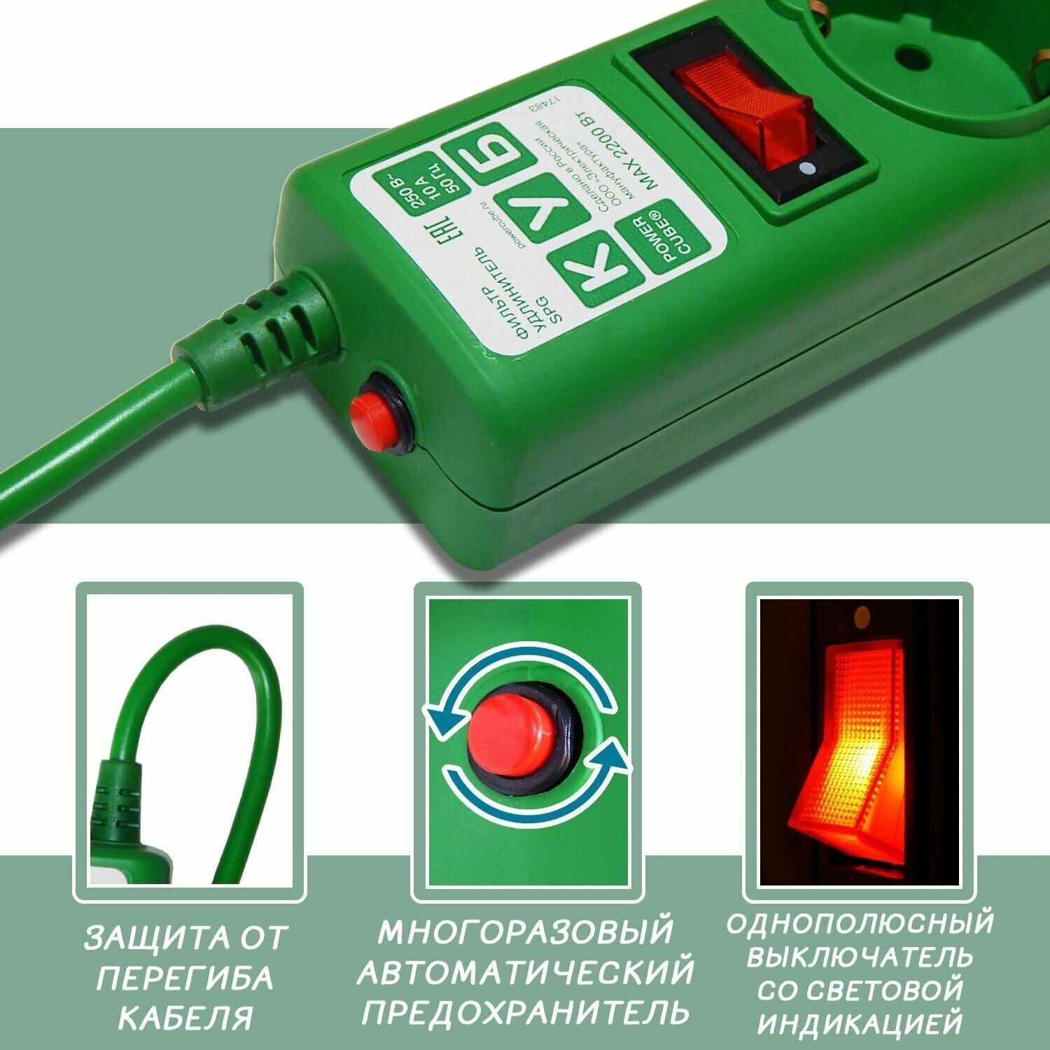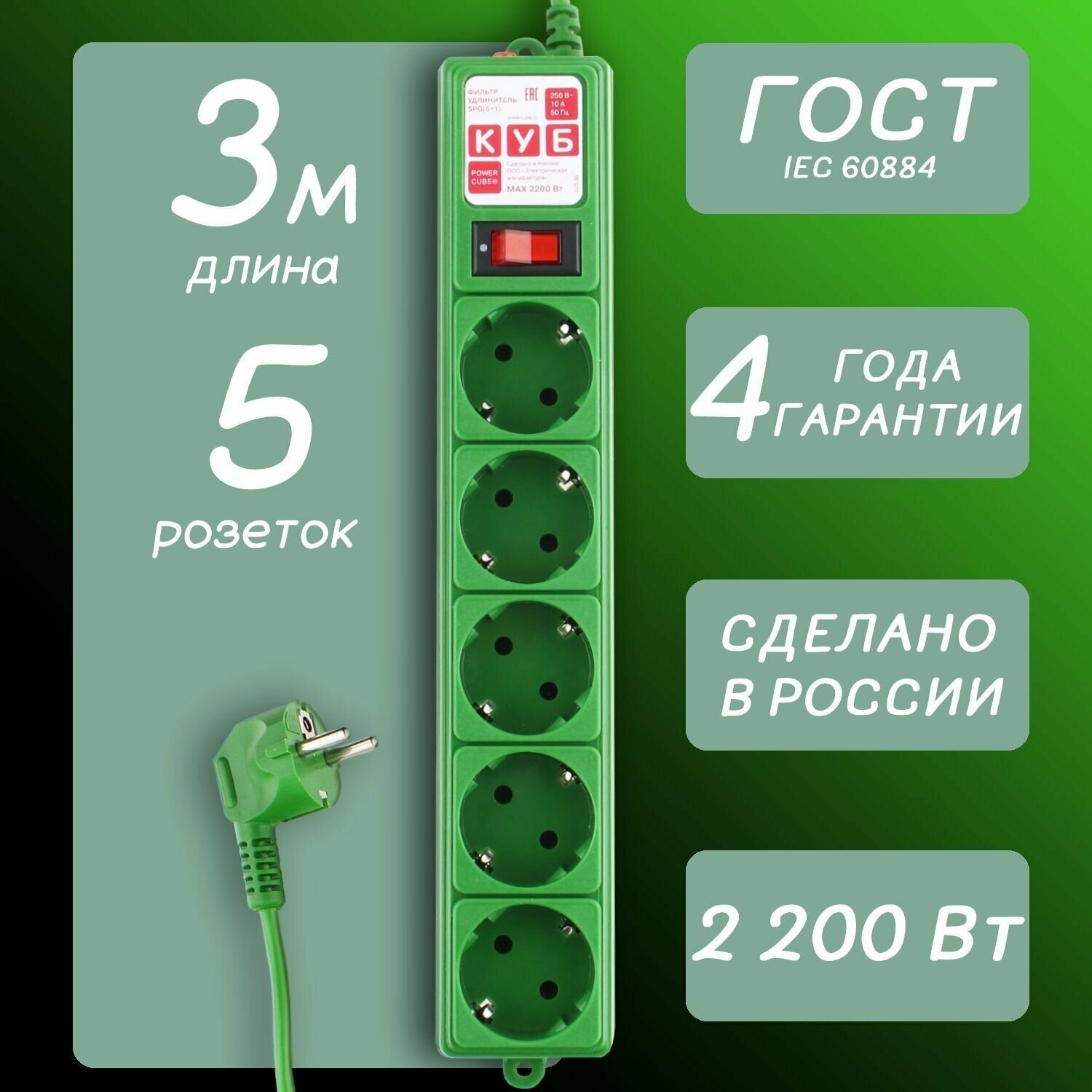 Фильтр-удлинитель Power Cube SPG-MXTR-13, 3 м, 5 розеток, зеленый, 10 А/2, 2 кВт