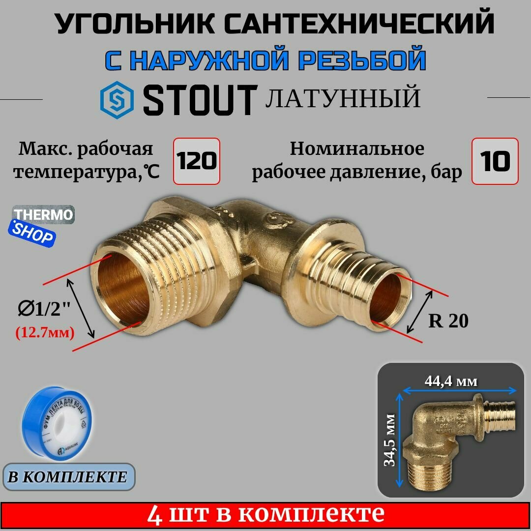 Угольник-переходник с НР 20xR 1/2" 4 шт для труб из сшитого полиэтилена аксиальный ФУМ лента 10 м информация: