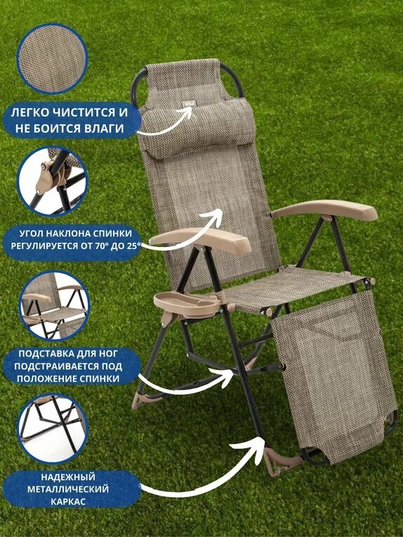 Кресло шезлонг складное с подножкой и полкой для сада и отдыха на природе