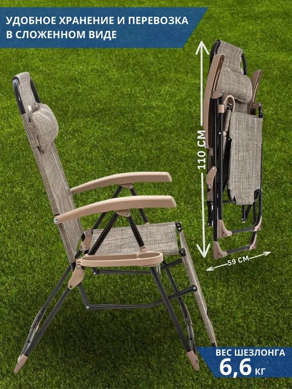 Кресло шезлонг складное с полкой, подножкой и съемным подголовником, 8 положений спинки