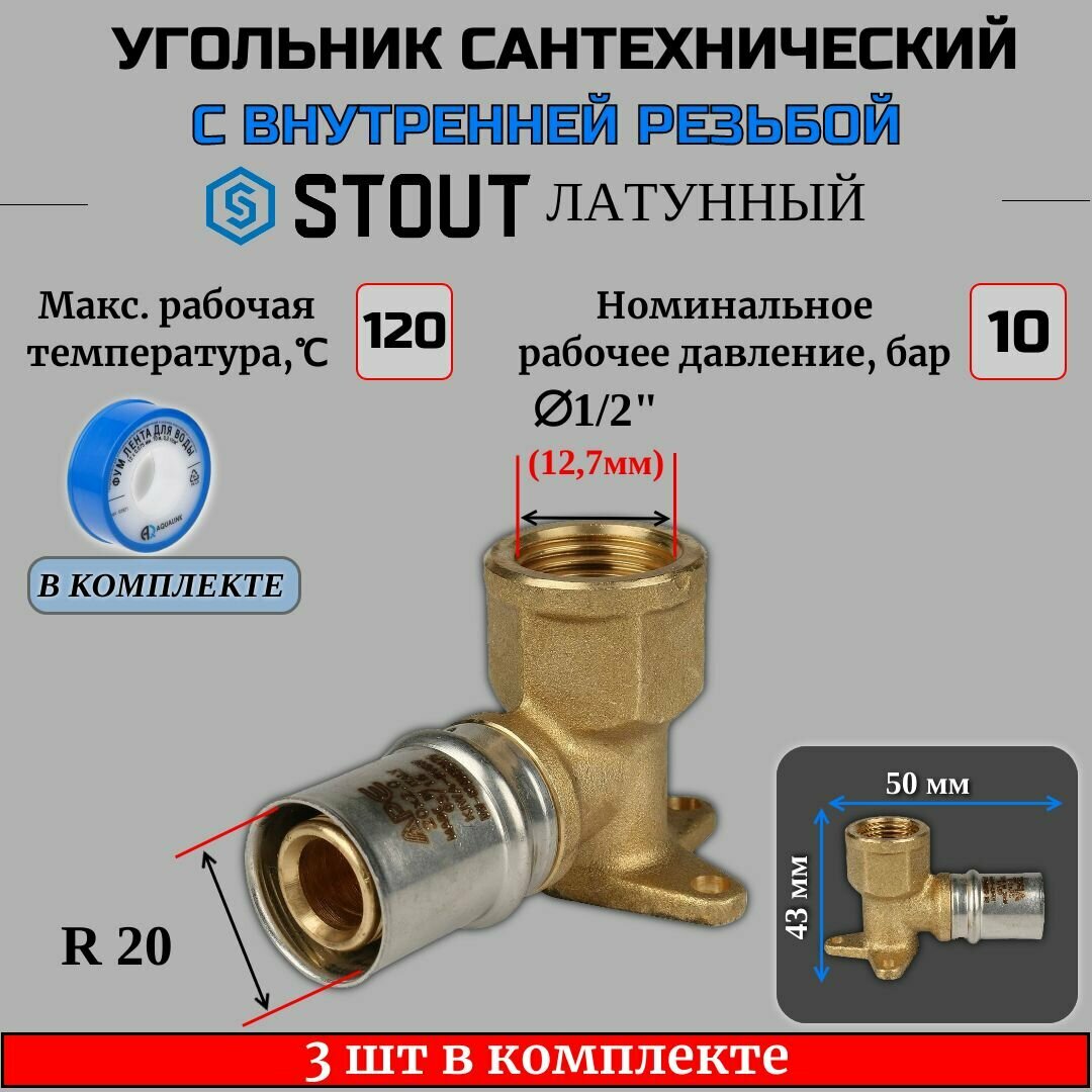 Угольник настенный с креплением короткий 1/2"х20 3 шт для металлопластиковых труб прессовой ФУМ лента 10 м информация: